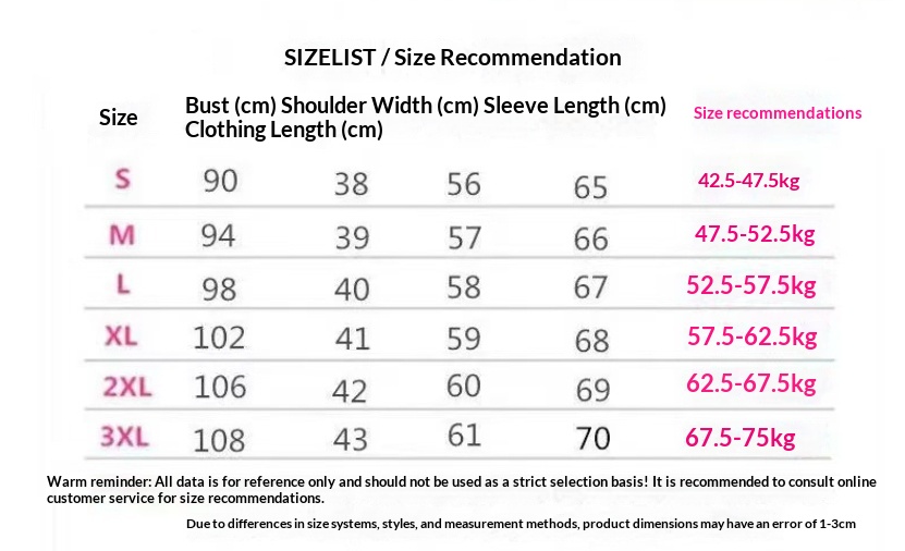 1. Asian sizes are 1 to 2 sizes smaller than European and American people. Choose the larger size if your size between two sizes. Please allow 2-3cm differences due to manual measurement. 2. Please check the size chart carefully before you buy the item, if you don't know how to choose size, please contact our customer service. 3.As you know, the different computers display colors differently, the color of the actual item may vary slightly from the following images.
