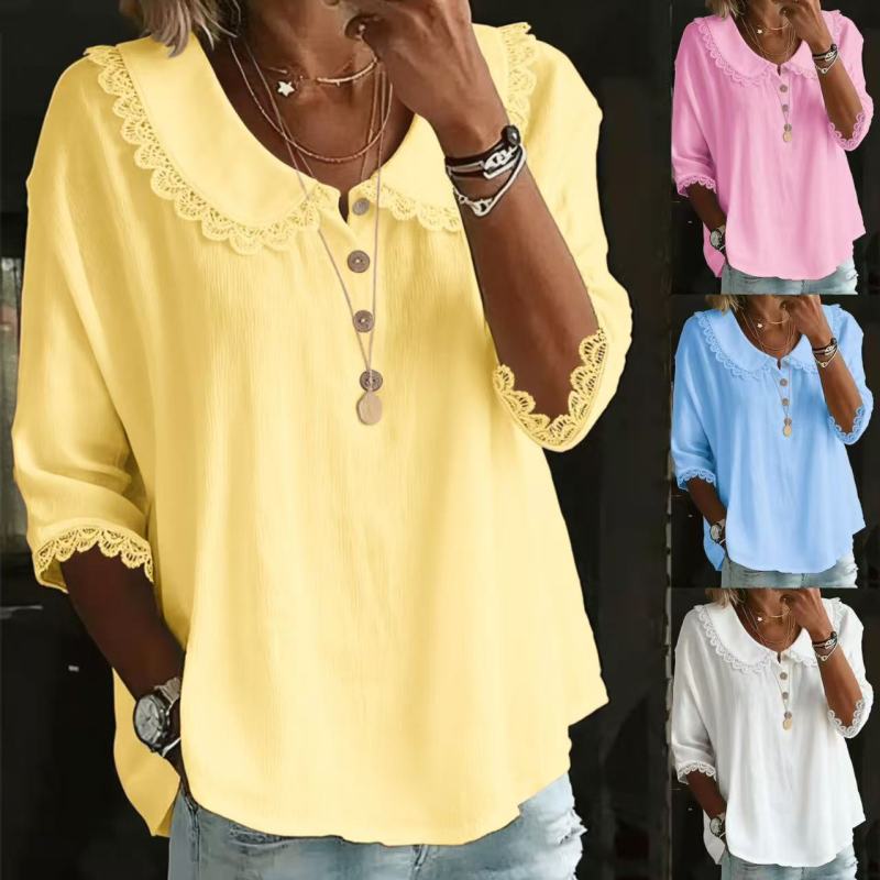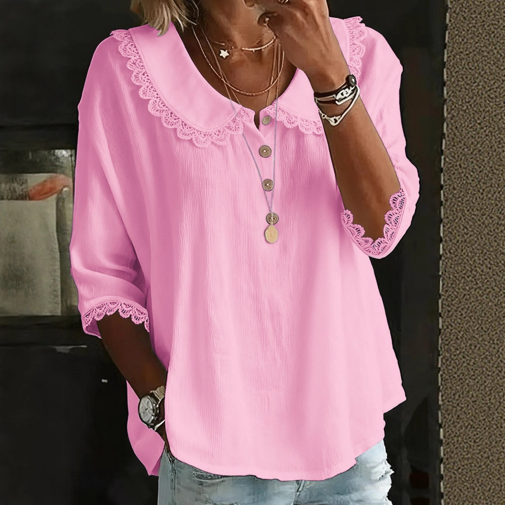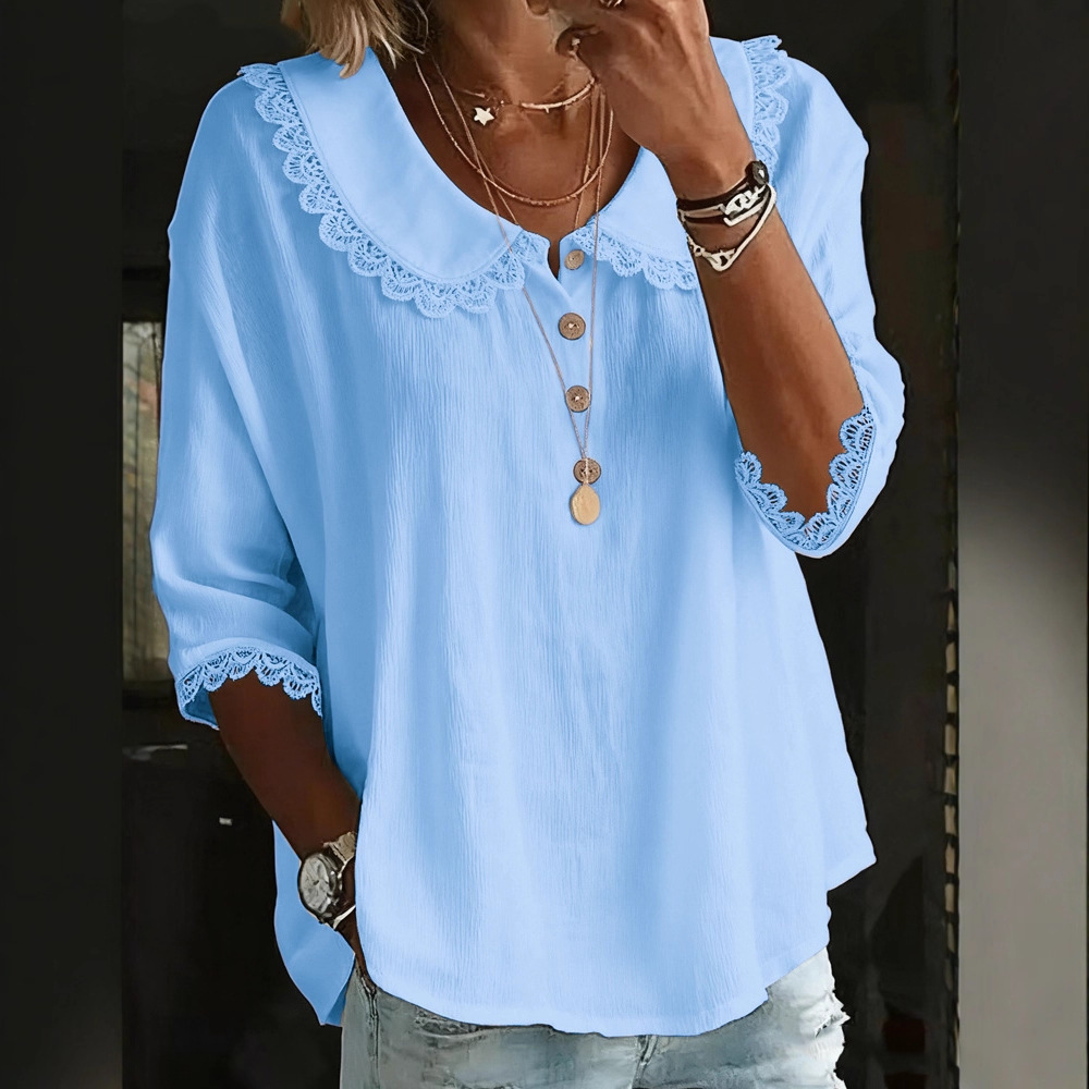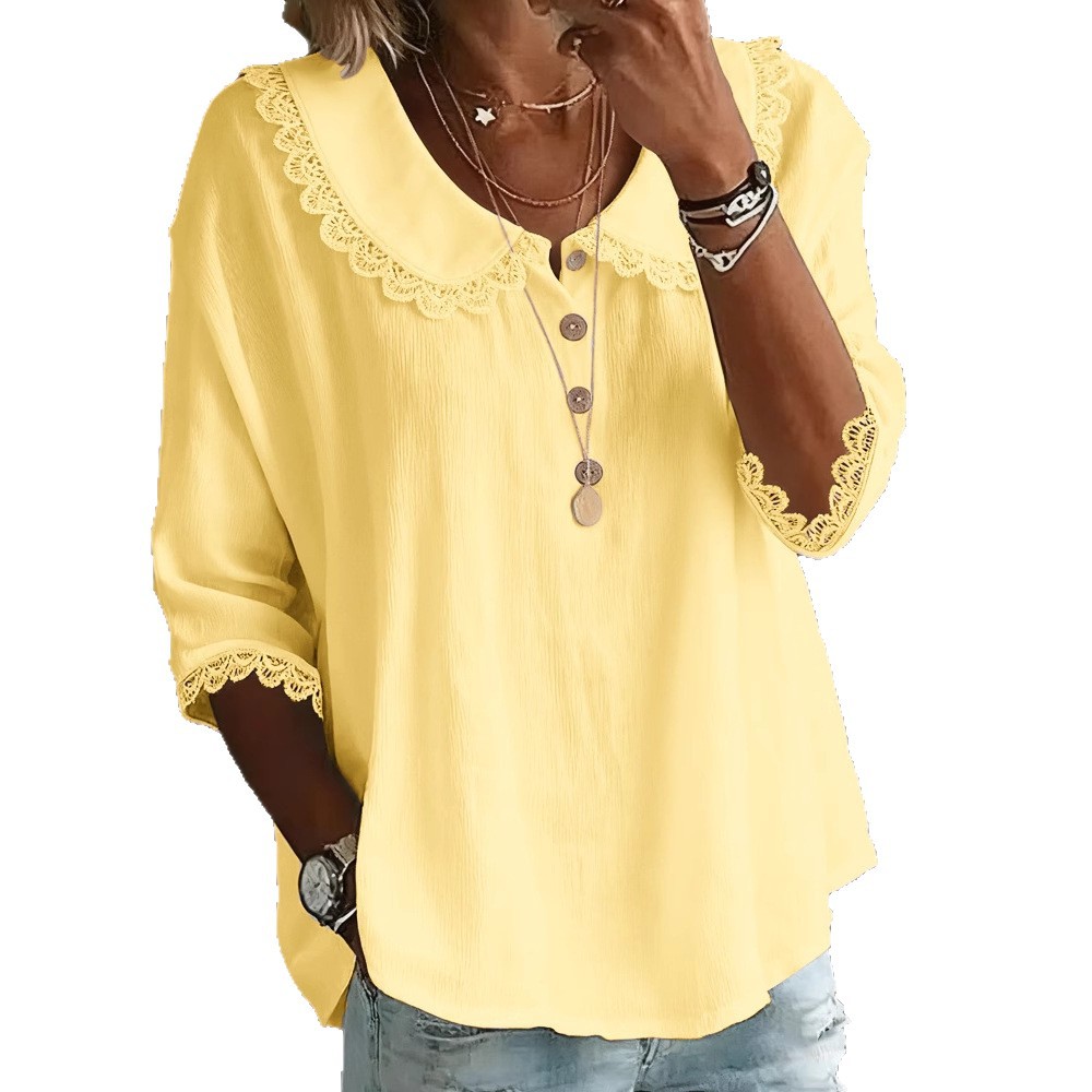 Fashionable Collar With Lace Trim, Solid-Color Button-Up Shirt