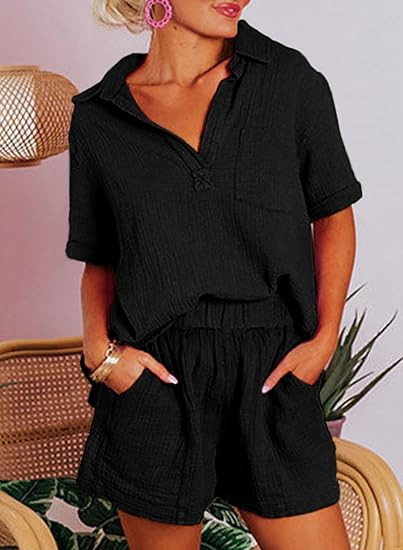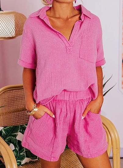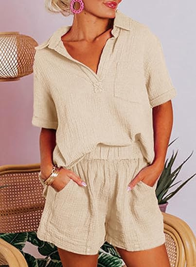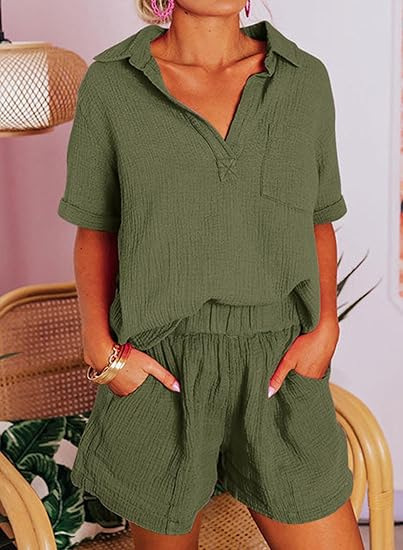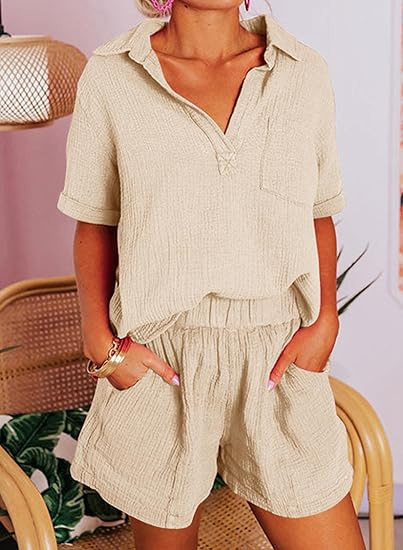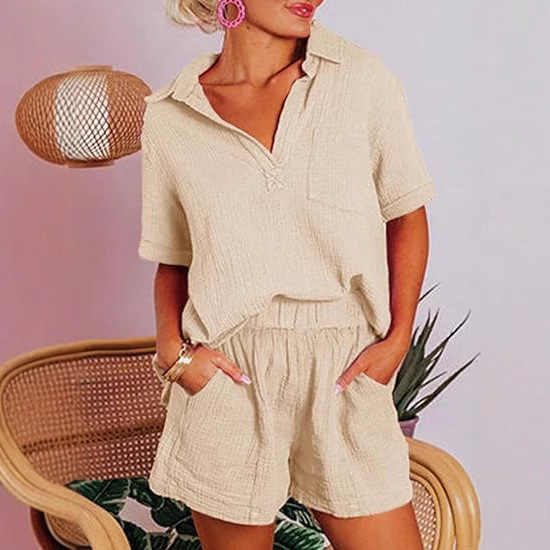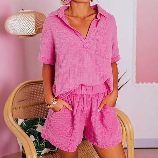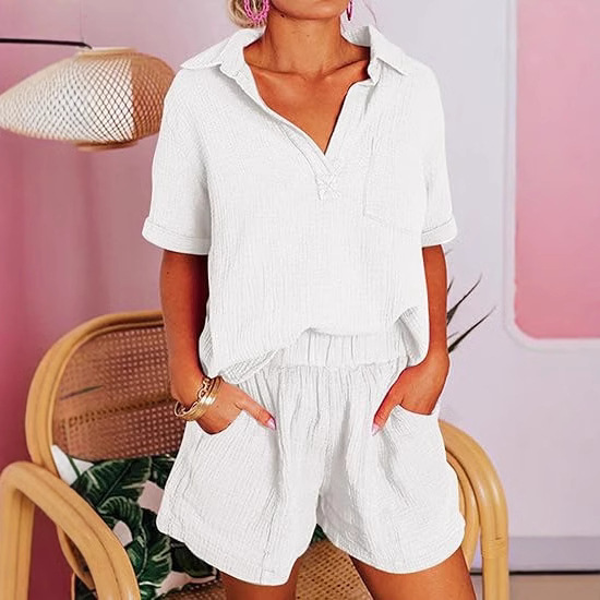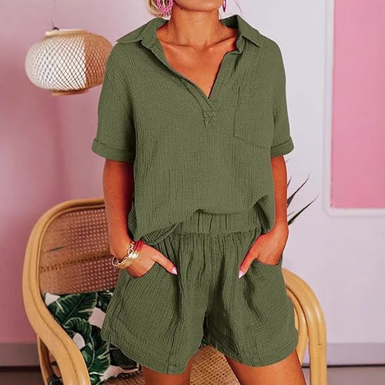 Fashionable Cotton-Linen Wrinkle-Effect Short-Sleeve Top And Shorts Womens Set