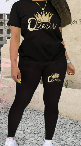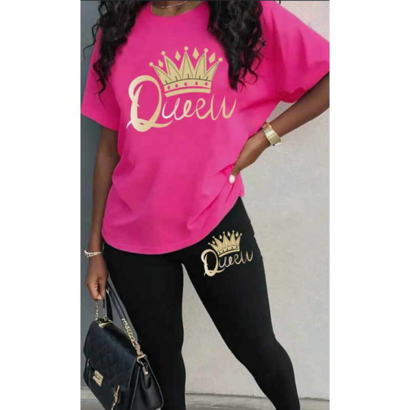 Fashionable Crown & Letter Print Short Sleeve Top And Leggings Set, Two Piece Outfit