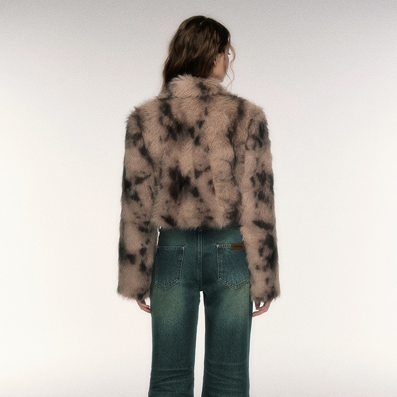 Fashionable Retro Sweet Cool Horn Button Short Leopard Print Faux Fur Coat Women
