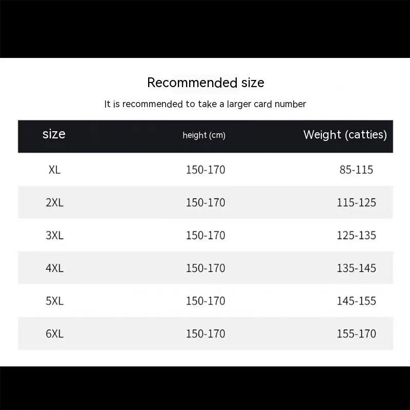 Size: XL recommended 45.00 kg-57.50 kg, 2XL recommended 57.50 kg-62.50 kg, 3XL recommended 62.50 kg-67.50 kg, 4XL recommended 67.50 kg-72.50 kg, 5XL recommended 72.50 kg-77.50 kg, 6XL recommended 77.50 kg-82.50 kg