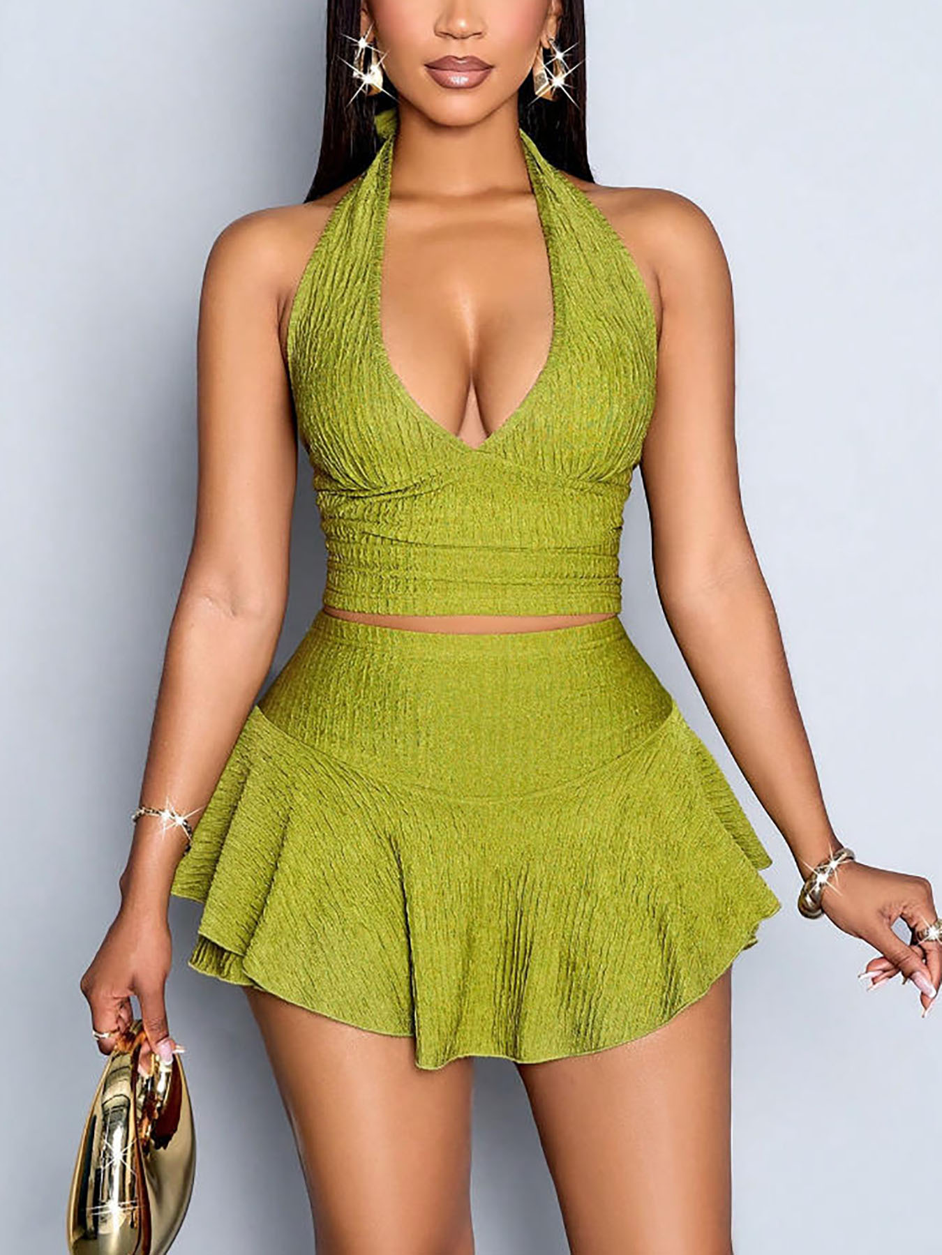 Fashionable Solid-Color Deep-V Backless Top And Skirt Set For Women