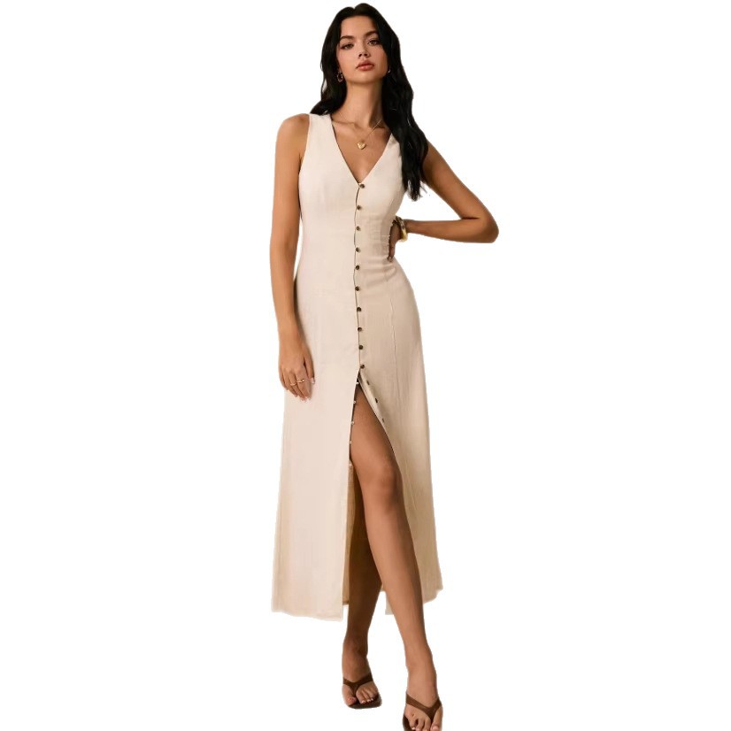 Fashionable Solid-Colored Multi-Button Sleeveless Long All-Match Dress