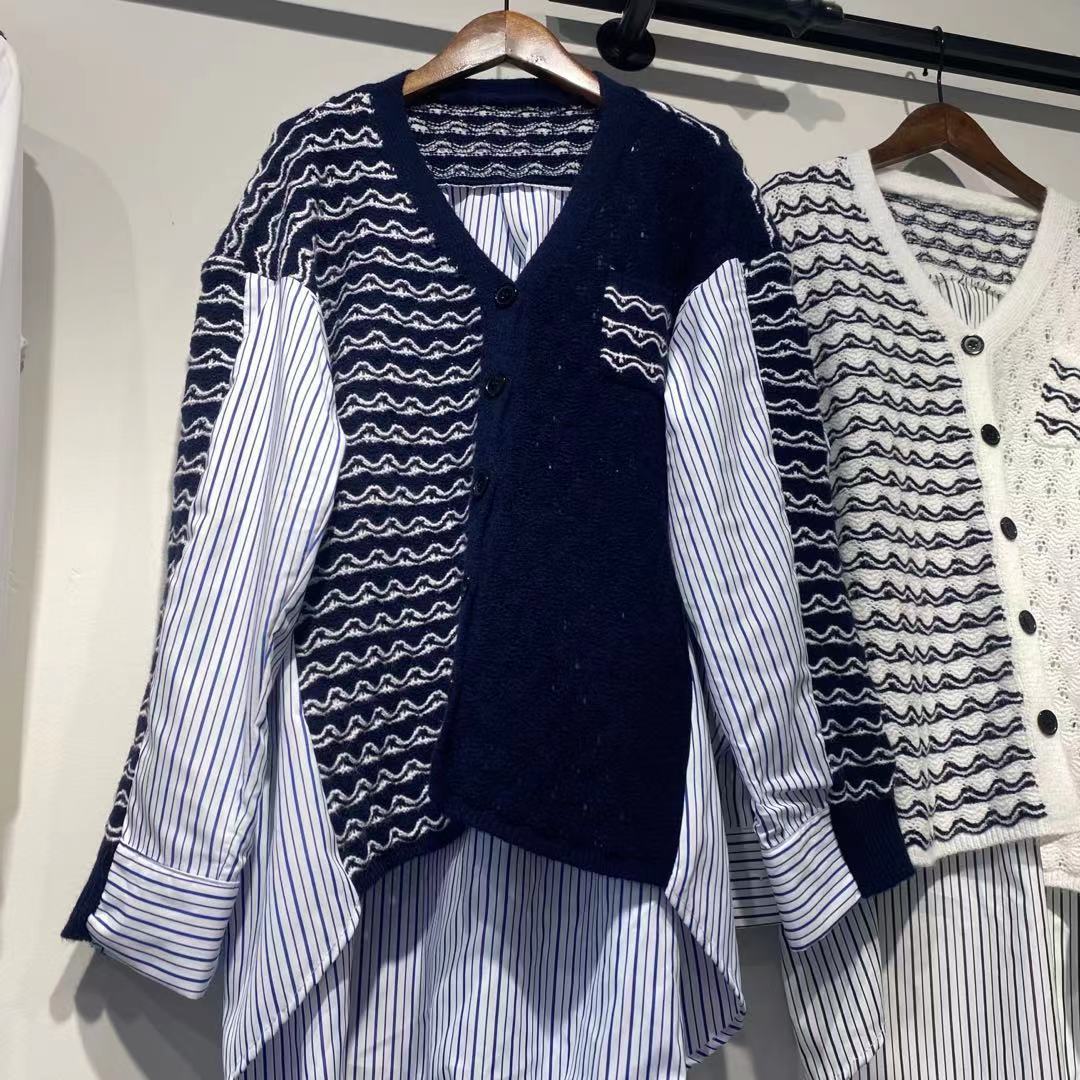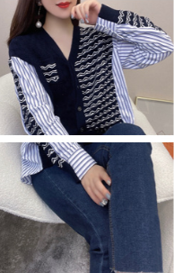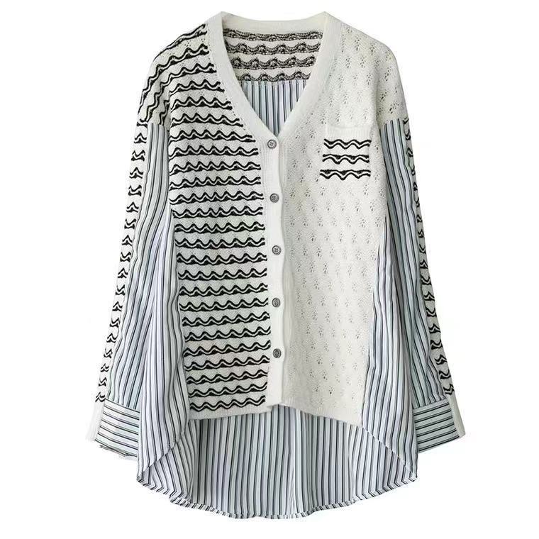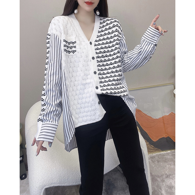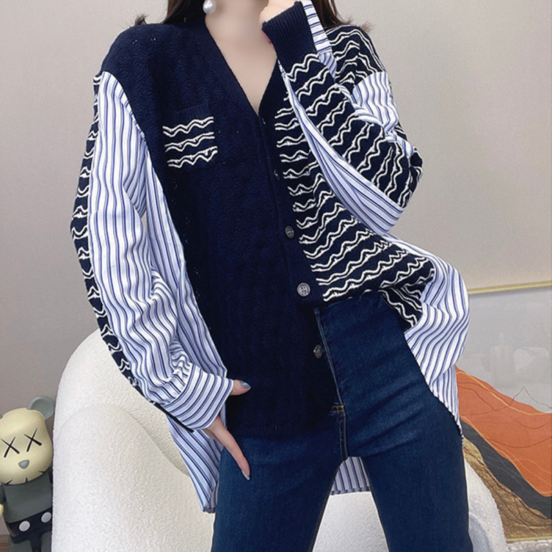 Fashionable V-neck Stitching Striped Loose Thin Top