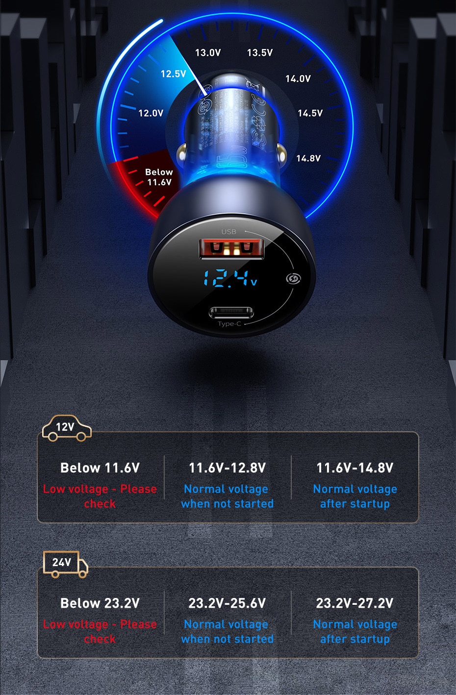Battery Voltage Monitoring Large screen digital display design, automatic detection of battery voltage, safer real-time monitoring. 12V Below 11.6V: Low voltage - Please check 11.6V-12.8V: Normal voltage when not started 11.6V-14.8V: Normal voltage after startup 24V Below 23.2V: Low voltage - Please check 23.2V-25.6V: Normal voltage when not started 23.2V-27.2V: Normal voltage after startup *The above data are measured by the Baseus laboratory, the actual use will be slightly different depending on the specific circumstances