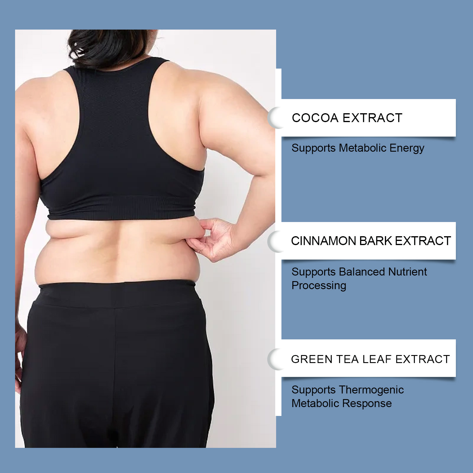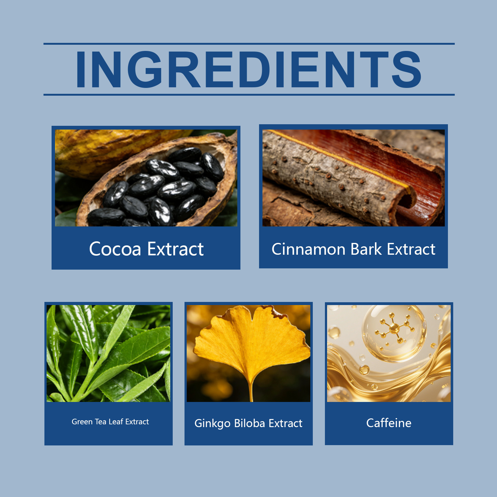 Ingredients: Cocoa extract, cinnamon bark extract, green tea extract, Ginkgo biloba extract, caffeine from Guarana.