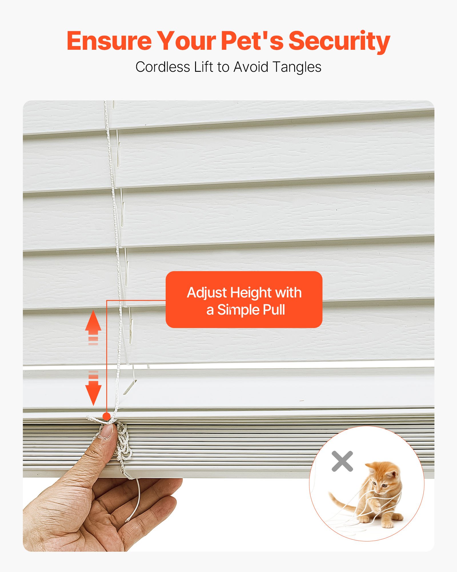 Cordless Secure Operation: The cordless faux wood blinds reduce the risk of pets getting tangled, allowing easy adjustment. Rotate the wand: fully open for ventilation, half open for soft light, or fully closed for privacy and light blocking