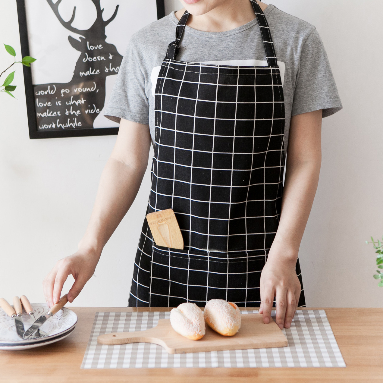 Color: gray fawn apron, gray plaid apron, black plaid apron, white plaid apron, small fir tree apron