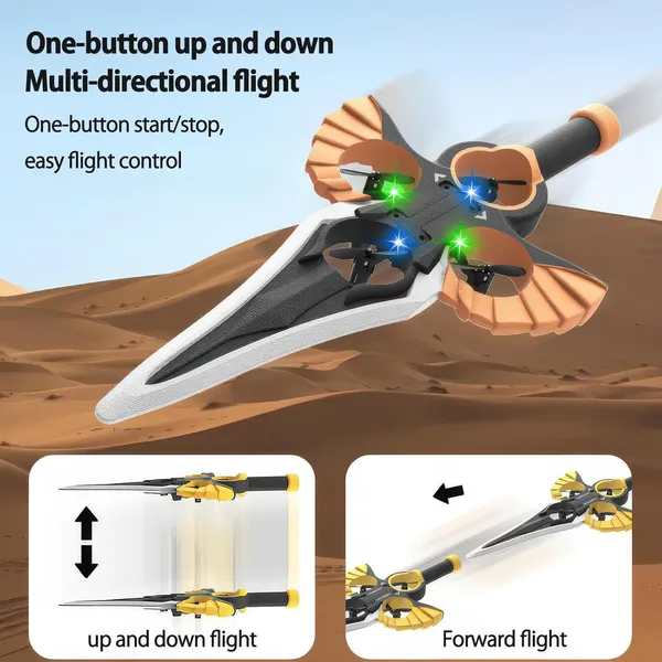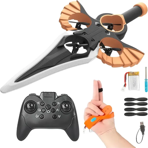 Dual Control Modes: Remote flying sword switch between intuitive hand‑gesture flight or classic handle‑type remote for ultimate versatility and fun • 3‑Speed Stunt Adjustment: Remote flying sword can fly low for smooth glides, Medium for steady cruising, High for thrilling aerial tricks—perfect for all skill levels • Auto Launch & Landing: One‑button lift‑off and gentle touchdown flying sword let beginners soar confidently without complex setup • Gyro‑Stabilized & Crash‑Resistant: Flying sword built‑in stabilization and reinforced EPP foam construction absorbs impact, keeping your glider flying longer • Outdoor Design: Constructed from lightweight, impact-resistant materials, this flying sword drone is built to handle outdoor bumps and crashes, providing reliable fun and long-lasting performance