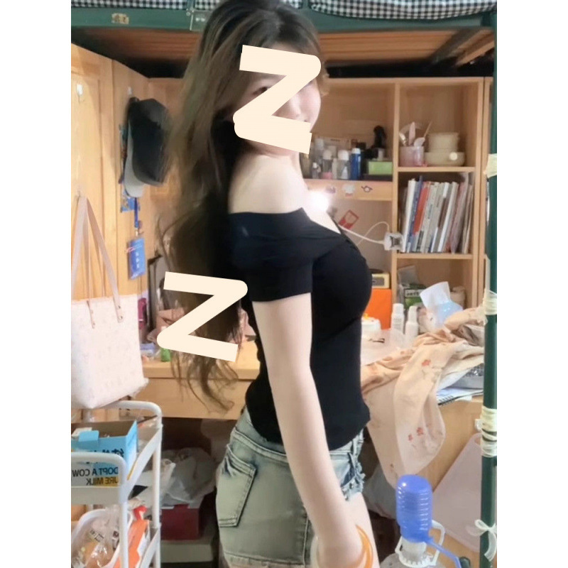 Female Solid Color One Shoulder Off Shoulder V-neck Short Sleeved Shirt