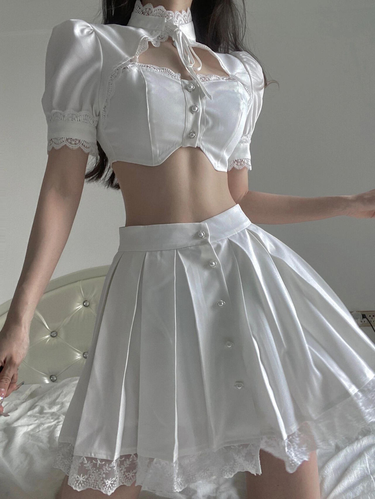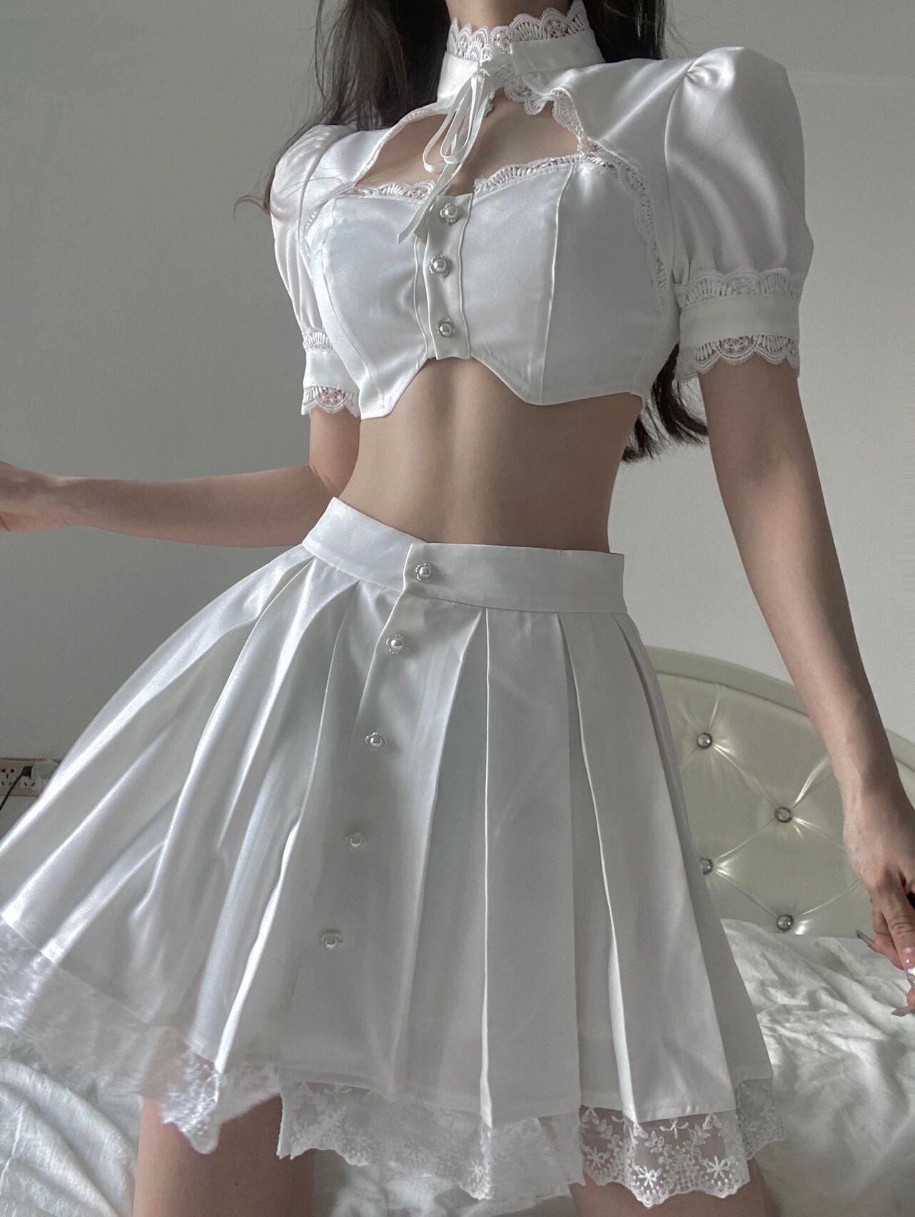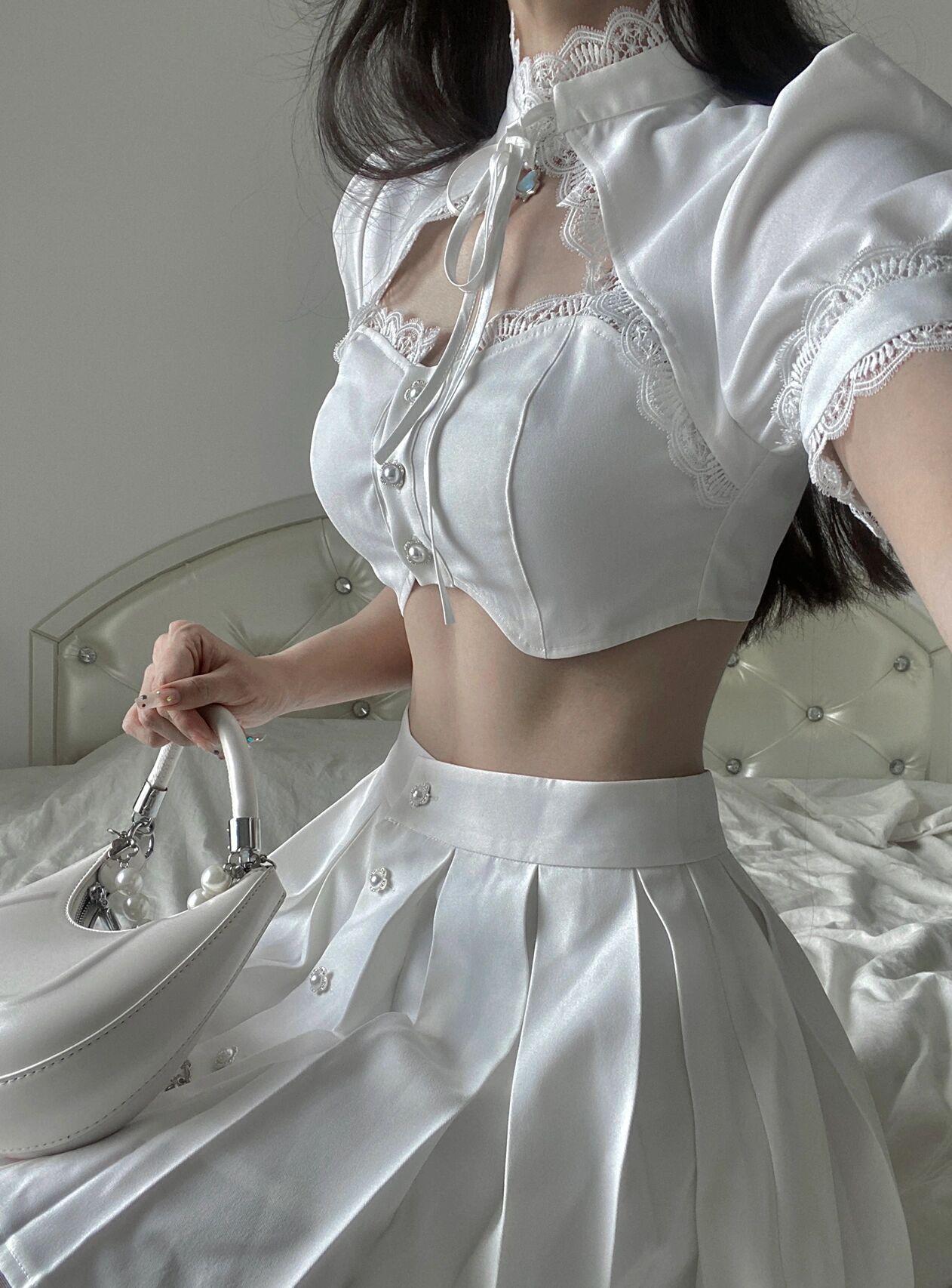 Female Sweet Niche Retro White Lace Top And Skirt