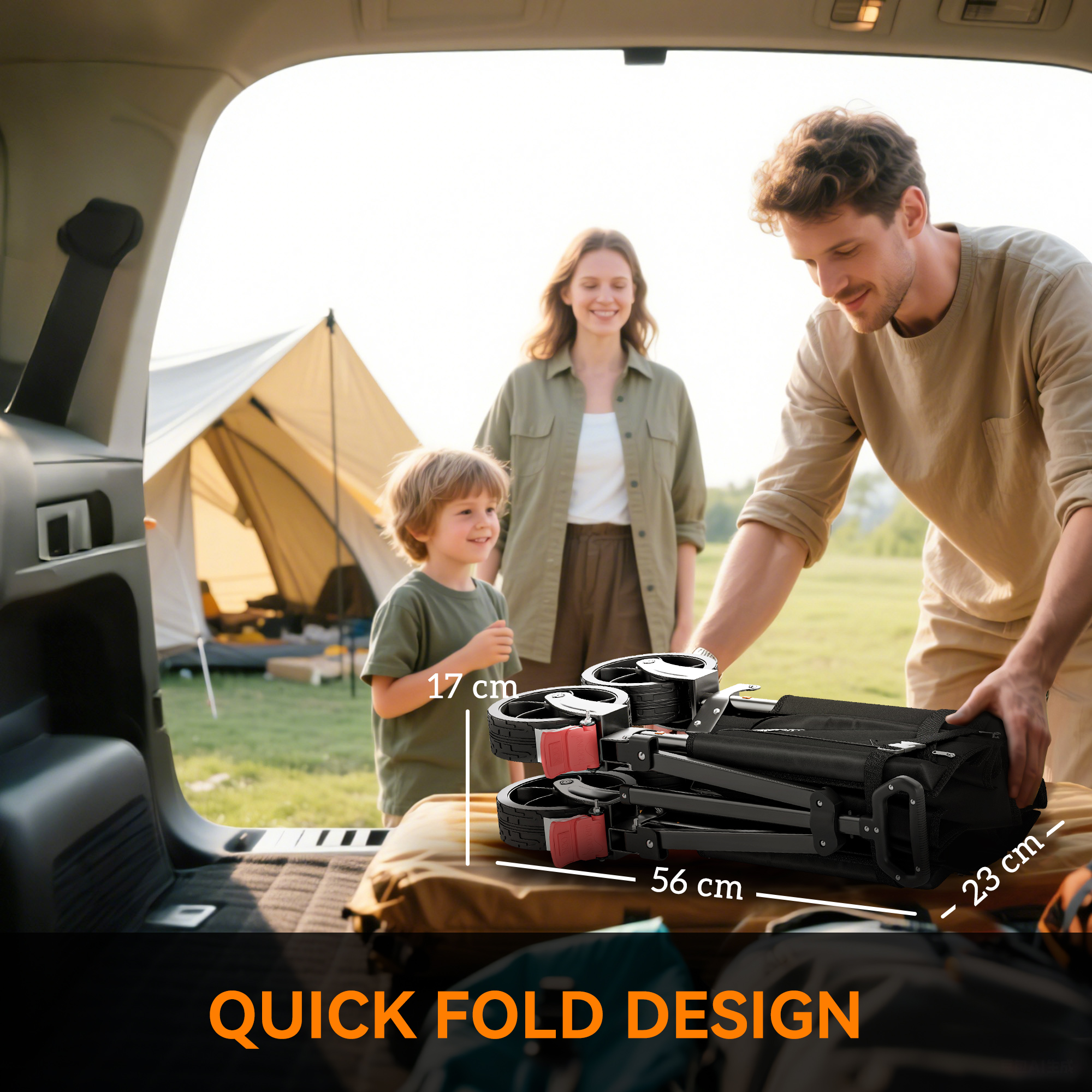 Discover the foldable camping trolley, your versatile companion for every adventure! Whether you're camping, gardening or fishing, effortlessly transport bulky items with its flattenable back and side. Keep everything organised with handy side pockets. Effortlessly navigate through any terrain with its 360° rotating wheels and enjoy easy storage as it collapses into a compact size. Great for those on the go!