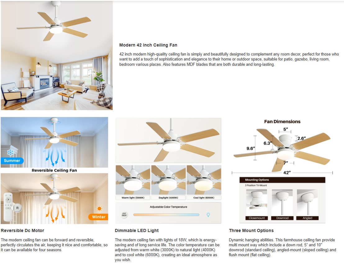 Product Name:42 Inch Modern Ceiling Fan With 3 Color Dimmable Light 5 Blades Remote Control Reversible DC Motor White
