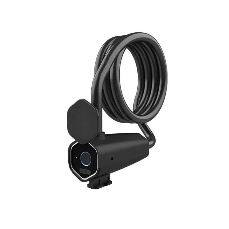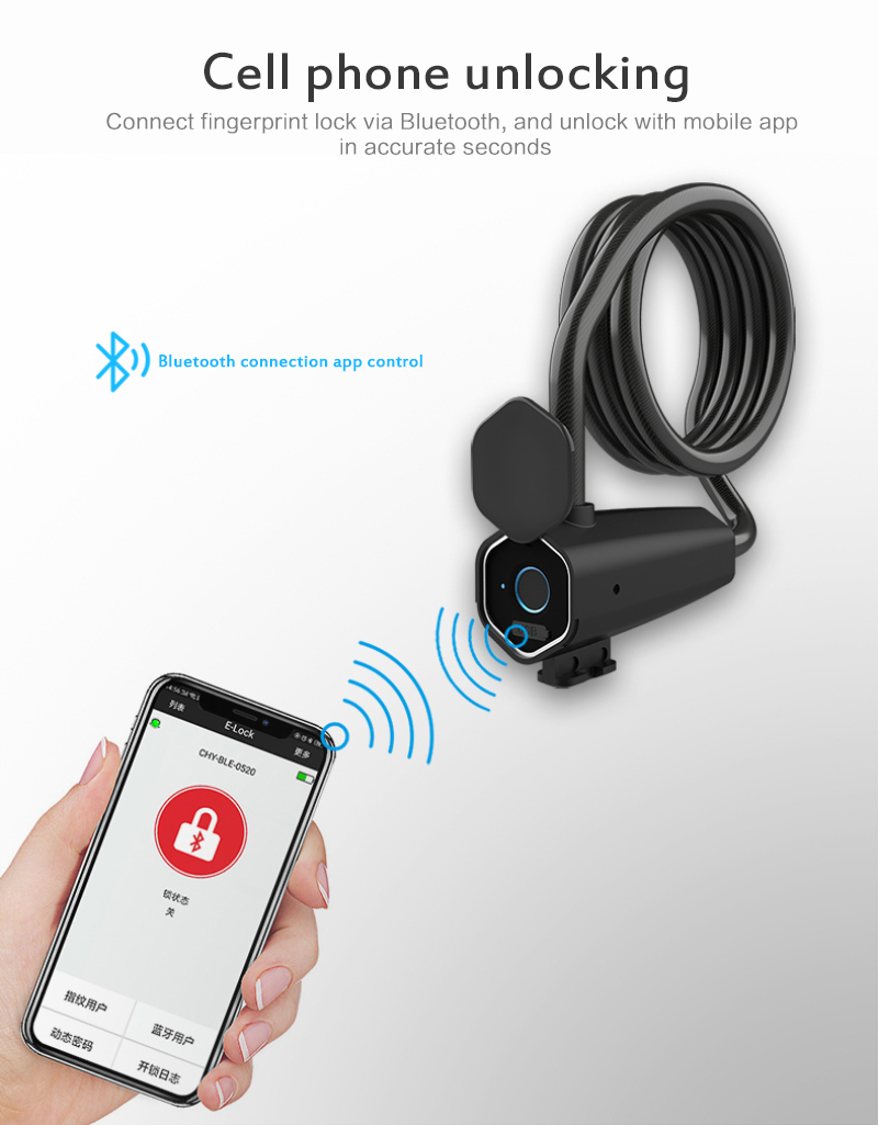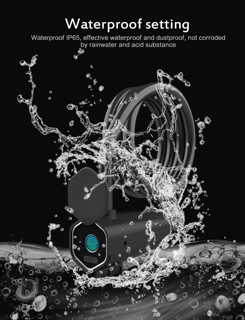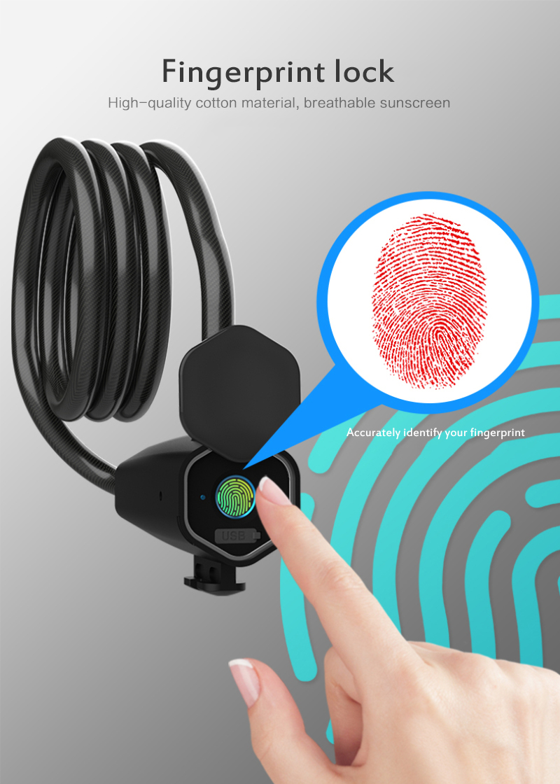 Product name: Bicycle smart fingerprint lockMaterial: PVC+Zinc AlloyLock rope material: steel bar + PVCBattery capacity: 300mah polymer battery