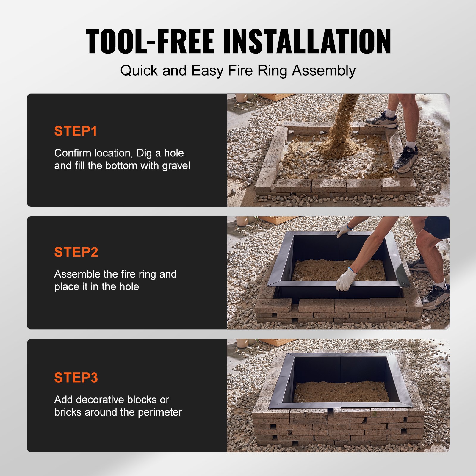 Core functional modules High temperature and rust resistant, durable and long-lasting Material selection: Made of high-temperature resistant carbon steel, covered with a matte black high-temperature powder coating on the surface. Core features: rust and corrosion prevention, can withstand extreme high temperatures and harsh weather, and is not easily damaged after long-term use. The flame is vigorous and burning fully Space design: With a large diameter, it provides ample space for wood burning to meet the natural growth needs of flames. Ventilation optimization: Reasonable structural design ensures good airflow, allowing firewood to be fully ignited and continuously burned, resulting in a more vigorous and beautiful flame. DIY flexible adaptation, available in multiple scenarios Versatile use: It can be directly used as a stable fire pit ring, or embedded in the ground (surrounding soil) to create an above ground fire pit. Freedom of combination: It can be combined with materials such as bricks and stones to meet personalized DIY construction needs. Applicable scenarios: Suitable for outdoor scenes such as park camping, courtyard gatherings, and holiday night heating, creating a warm atmosphere. Stable structure and safe use Reinforcement design: Multiple sets of screws are equipped on the circular edges and sides to enhance overall stability through multiple reinforcements. Joint technology: The top joint is neatly and tightly connected, seamless and firm, and is not easy to loosen or deform during use.