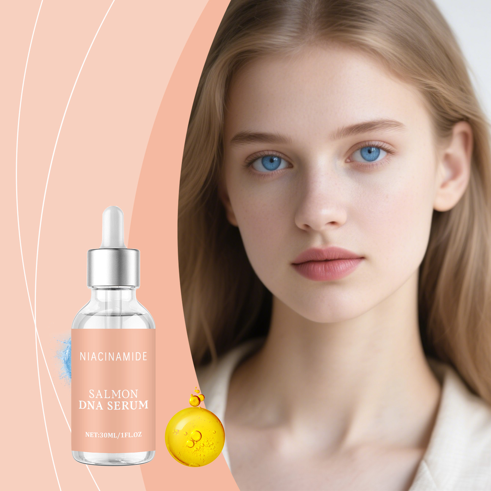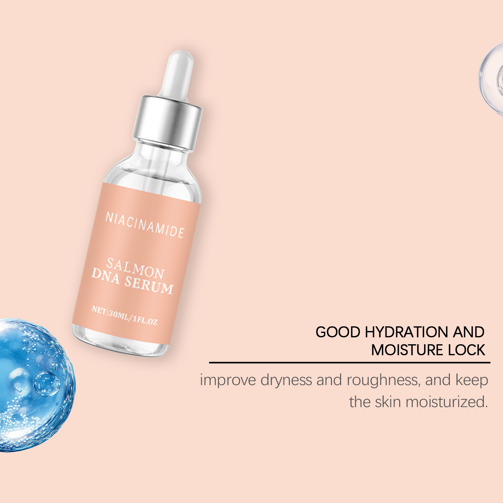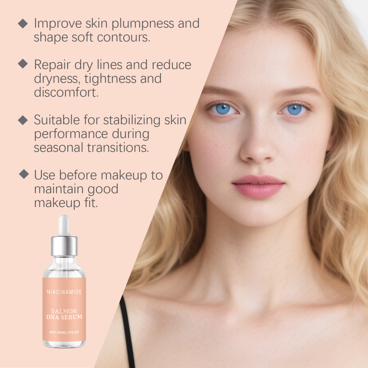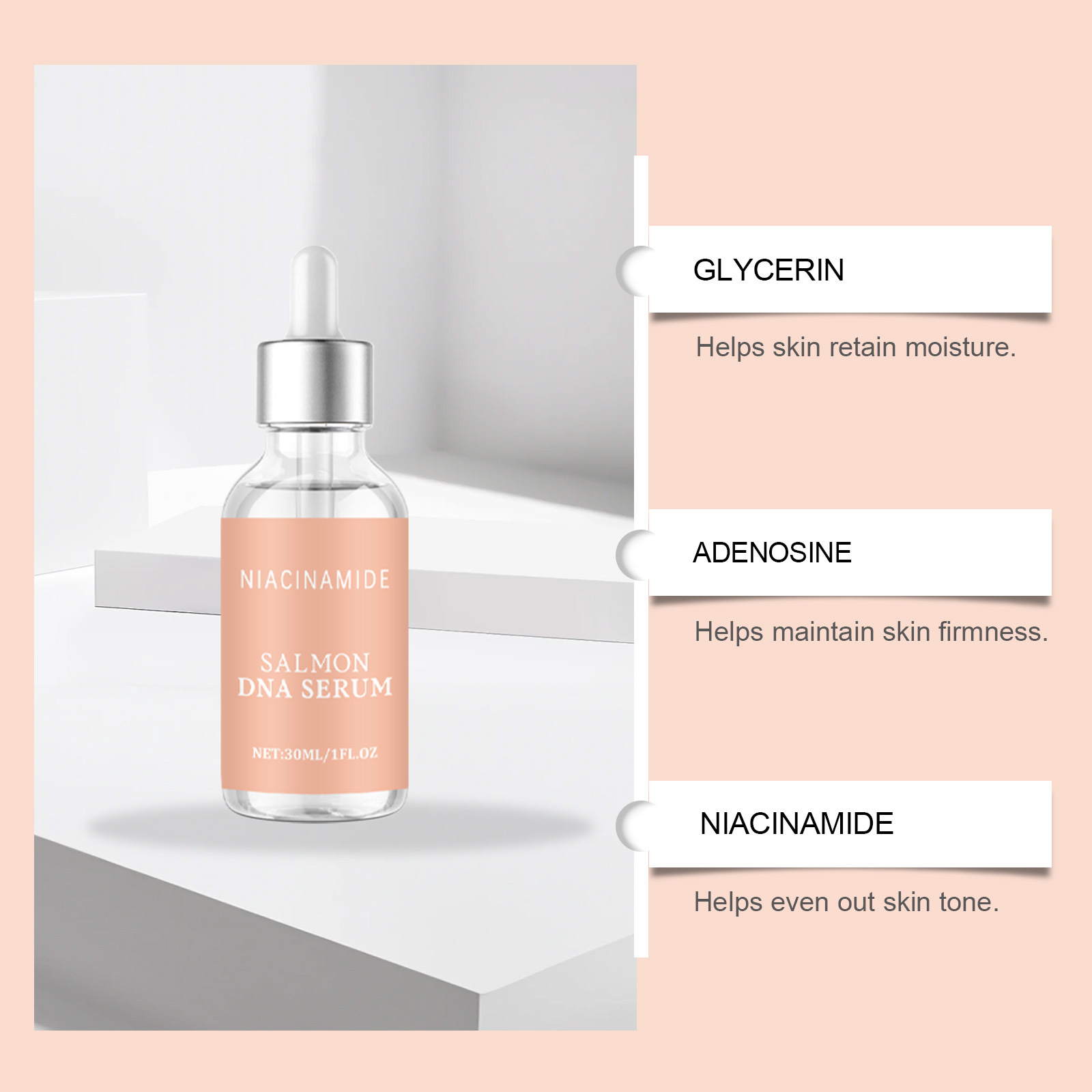 Ingredients: water, glycerin, hydrogenated castor oil, 1,2- hexanediol, carbomer, arginine, salmon egg extract, DNA sodium, palmitoyl hexapeptide -12, nicotinamide, adenosine, basil leaf extract, hydrolyzed collagen.