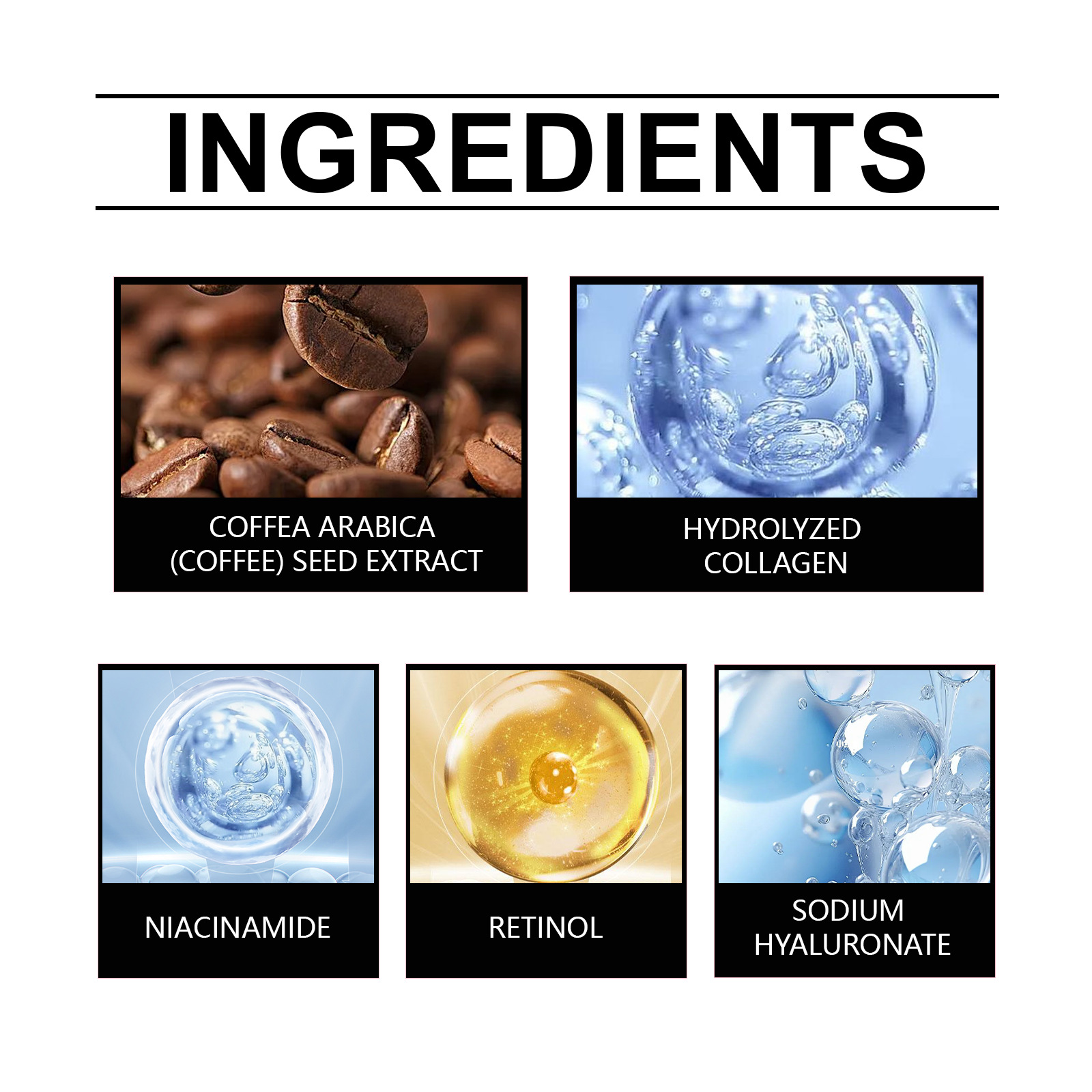 Ingredients: Retinol, coffee extract, sodium hyaluronate, Hydrolyzed collagen, nicotinamide