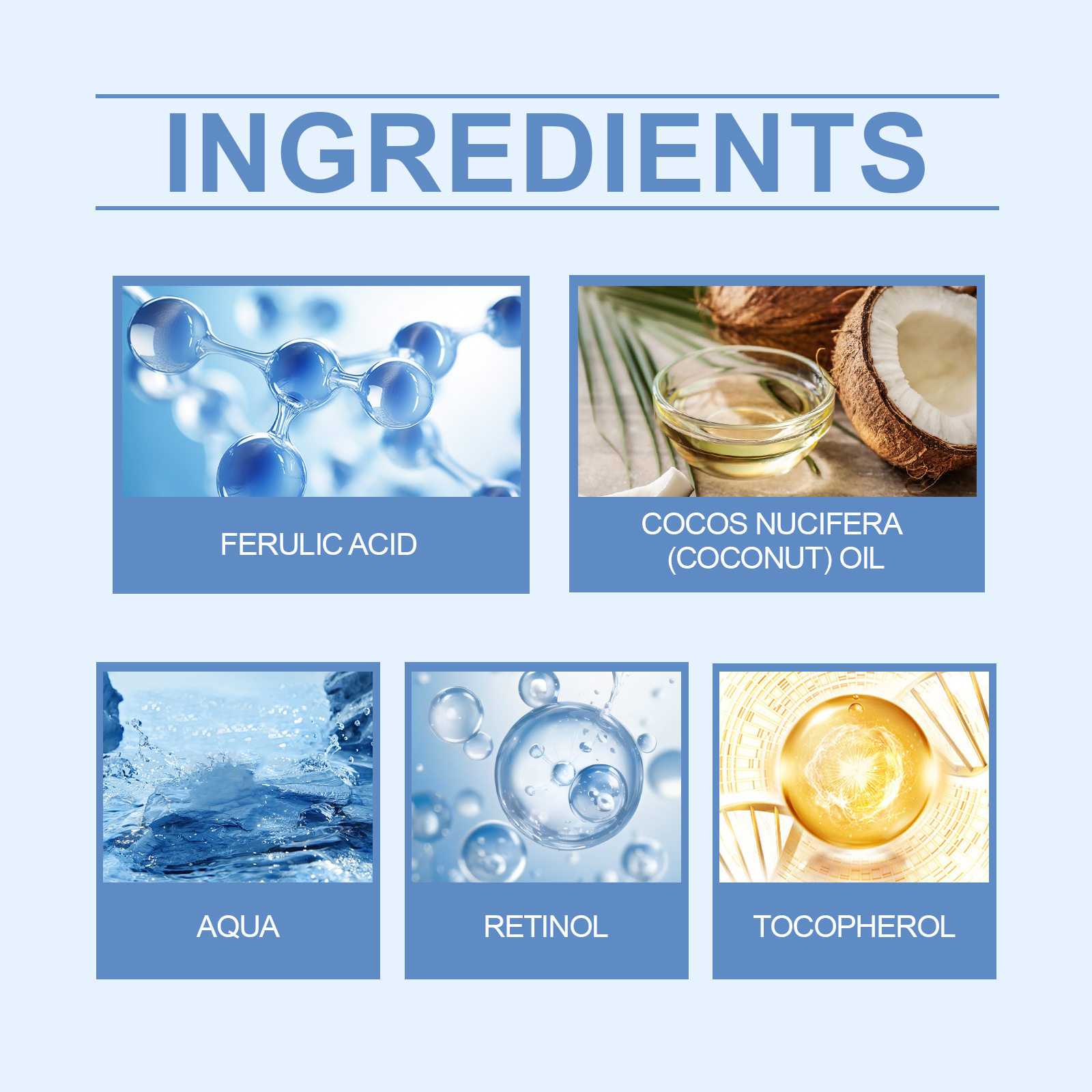 Ingredients: Water, retinol, ferulate, coconut oil, tocopherol (vitamin E)