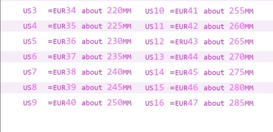 Sizes 34, 35, 36, 37, 38, 39, 40, 41, 42, 43