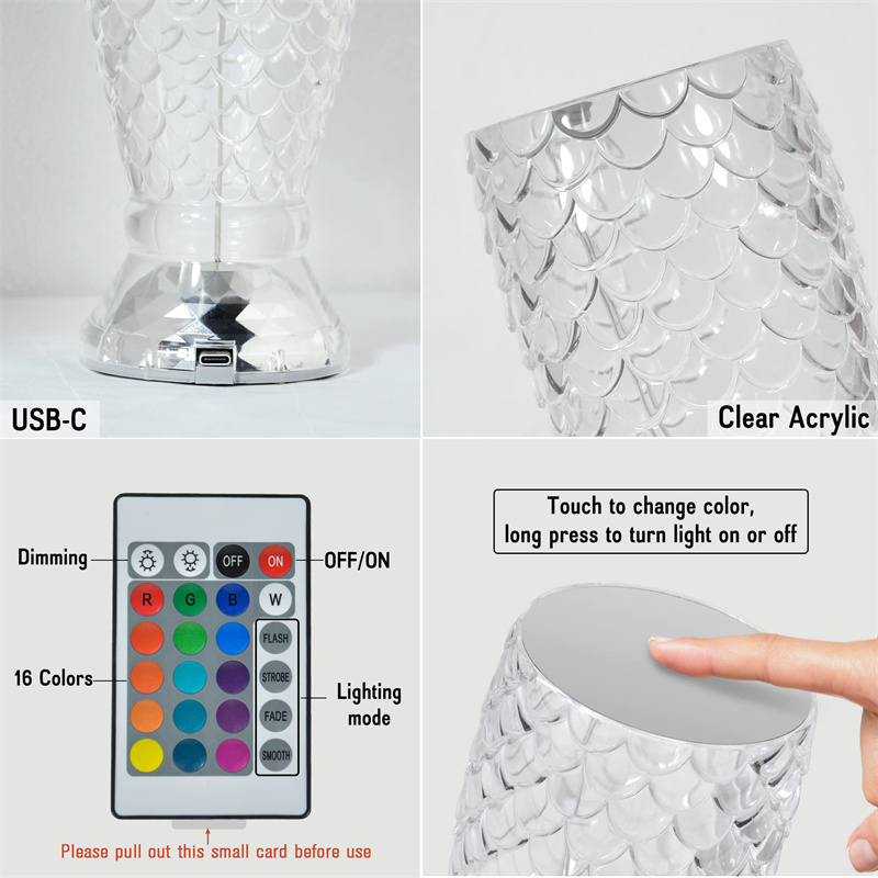 【Crystal Lamp for Everyone】Upgraded version of the rose crystal table lamp, made of transparent acrylic with a crystal glass look. 3D imitation fish scale appearance design reflects a beautiful and elegant light. Its glass-like exterior bends the light into a pattern that stands out from other lamps. A small lamp adds the perfect amount of light to your living room or bedroom to create a comfortable and romantic ambiance.