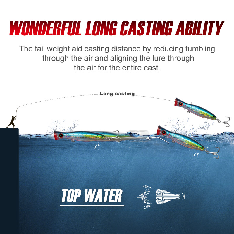 3. "Z" Action- the lure will deliver an aggressive popping action and gurgling sound, while the rattle chamber generates vibration, noise and water splash, to call out all the big fishes out from the depth.