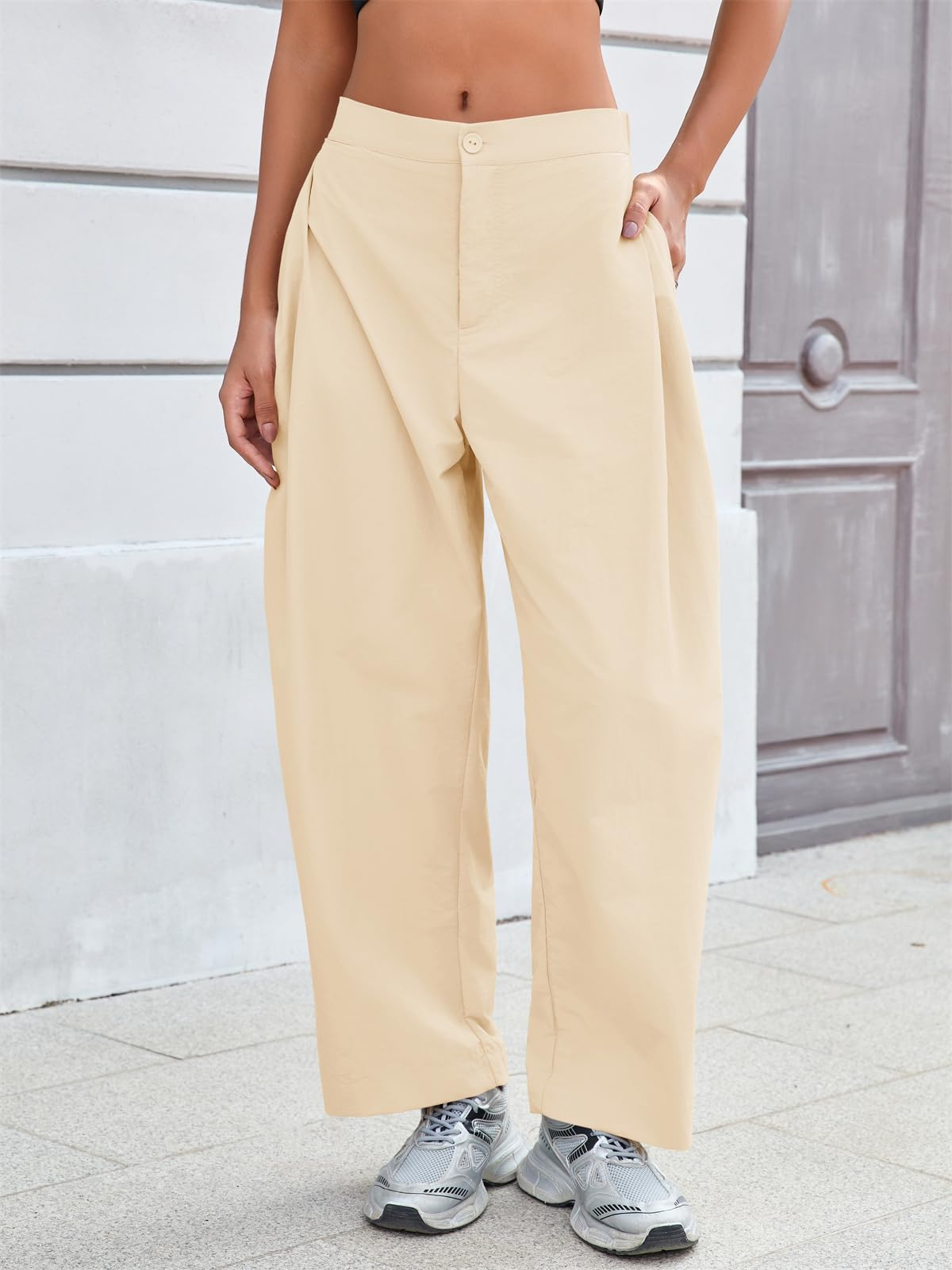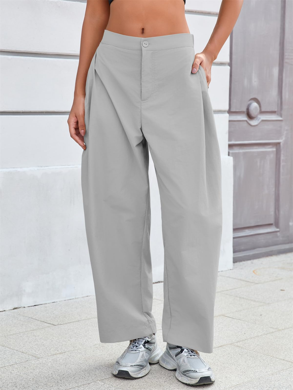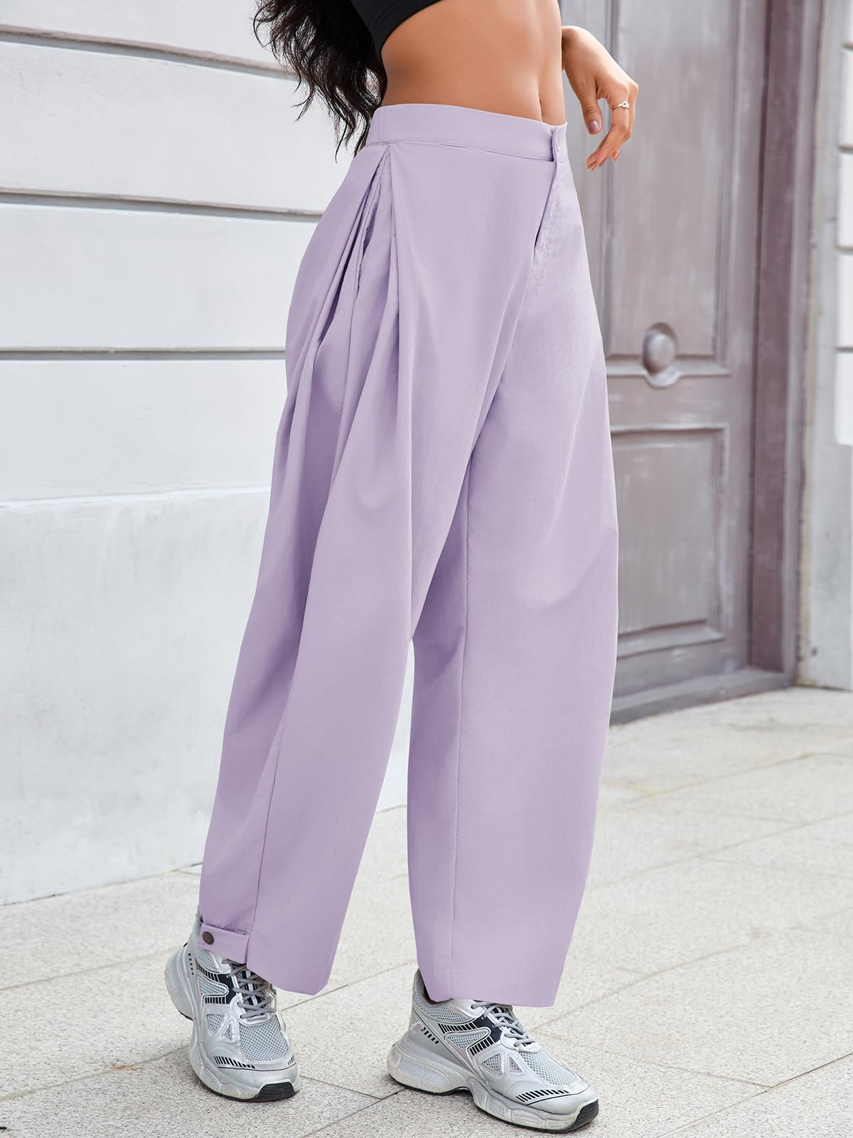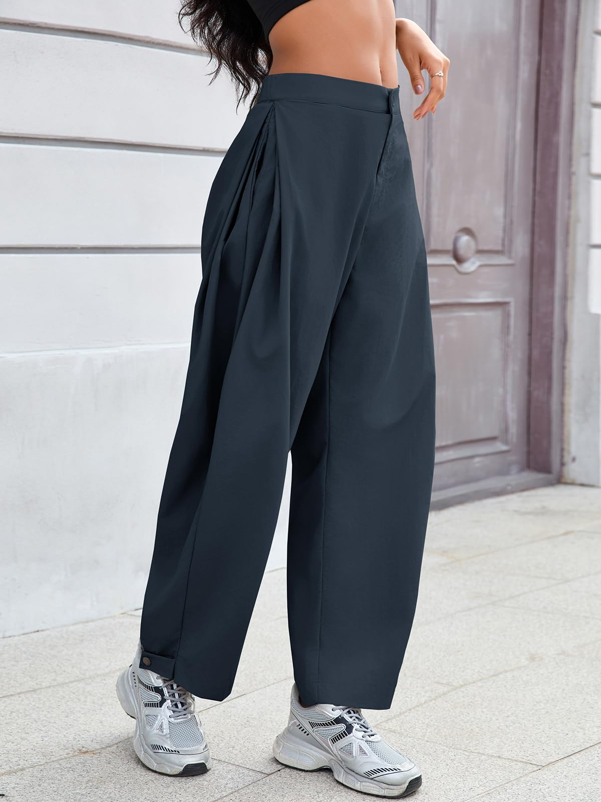 Fisoew Barrel Pants Women Casual Wide Leg Baggy Pants Side Pleated Horseshoe Style Trousers With Pockets