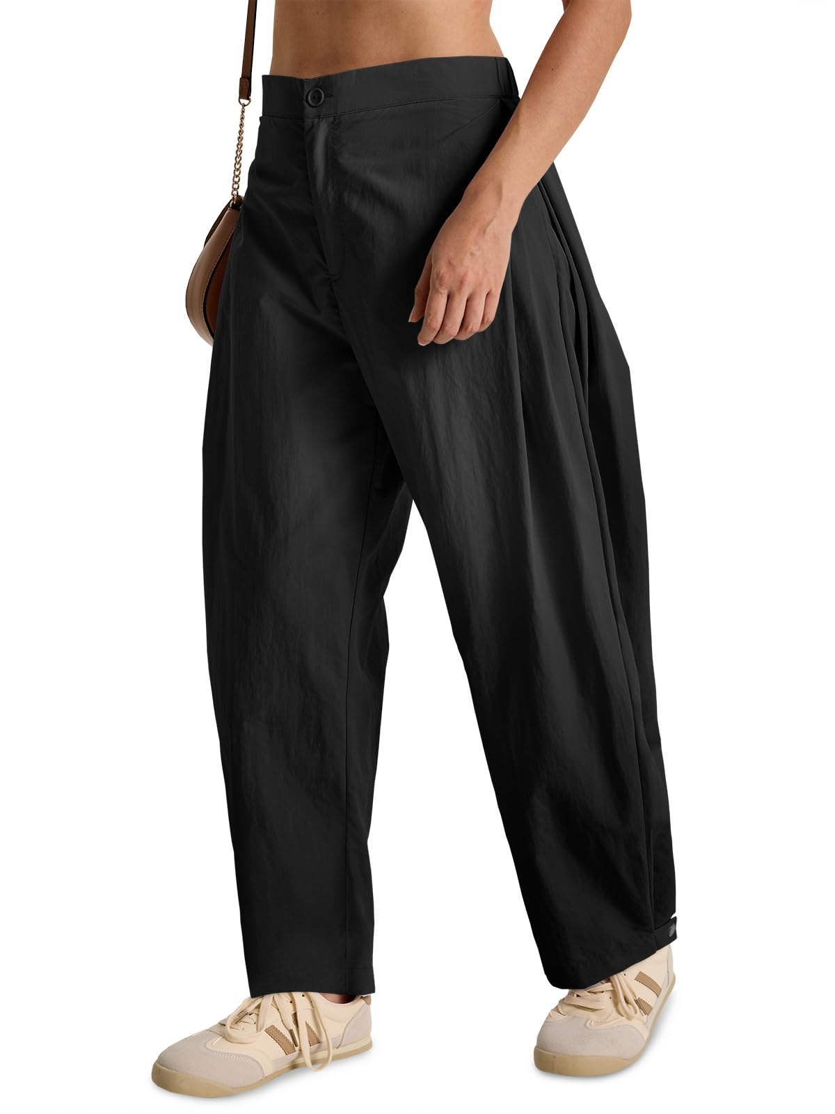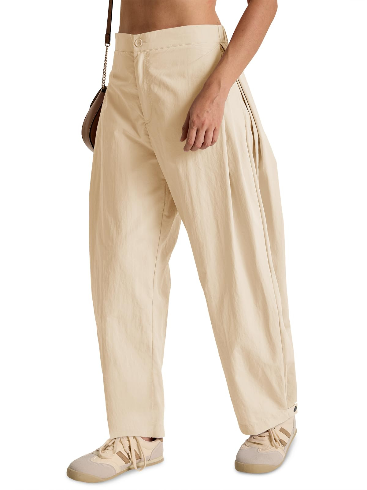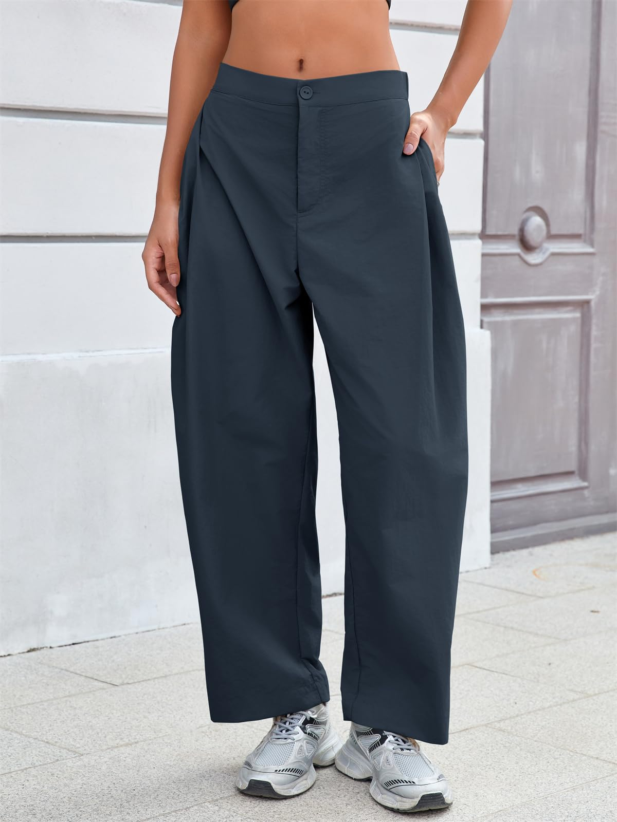 Fisoew Barrel Pants Women Casual Wide Leg Baggy Pants Side Pleated Horseshoe Style Trousers With Pockets