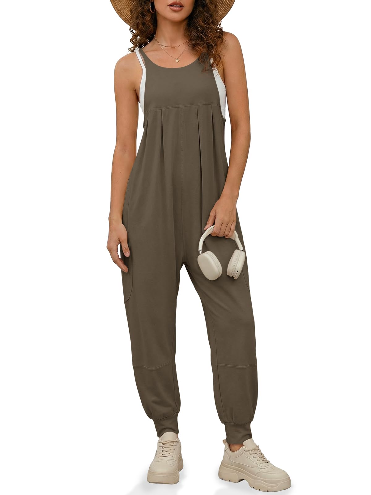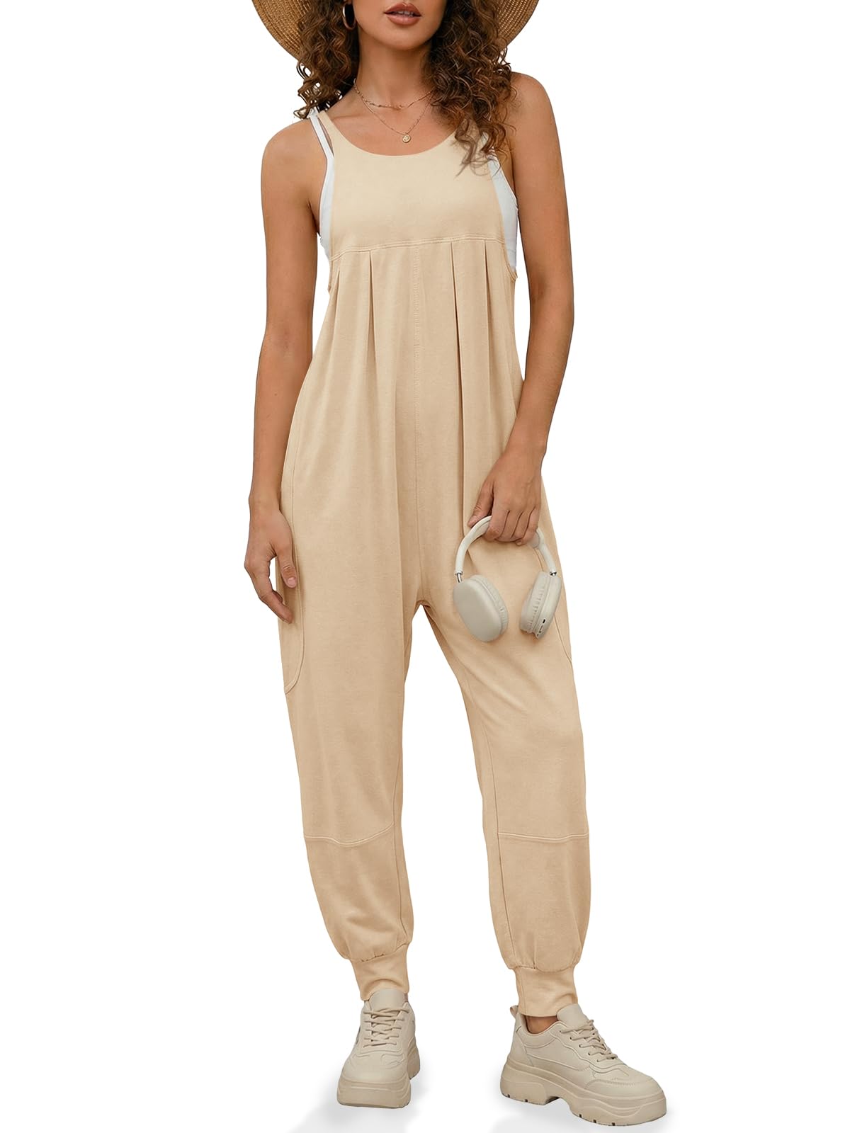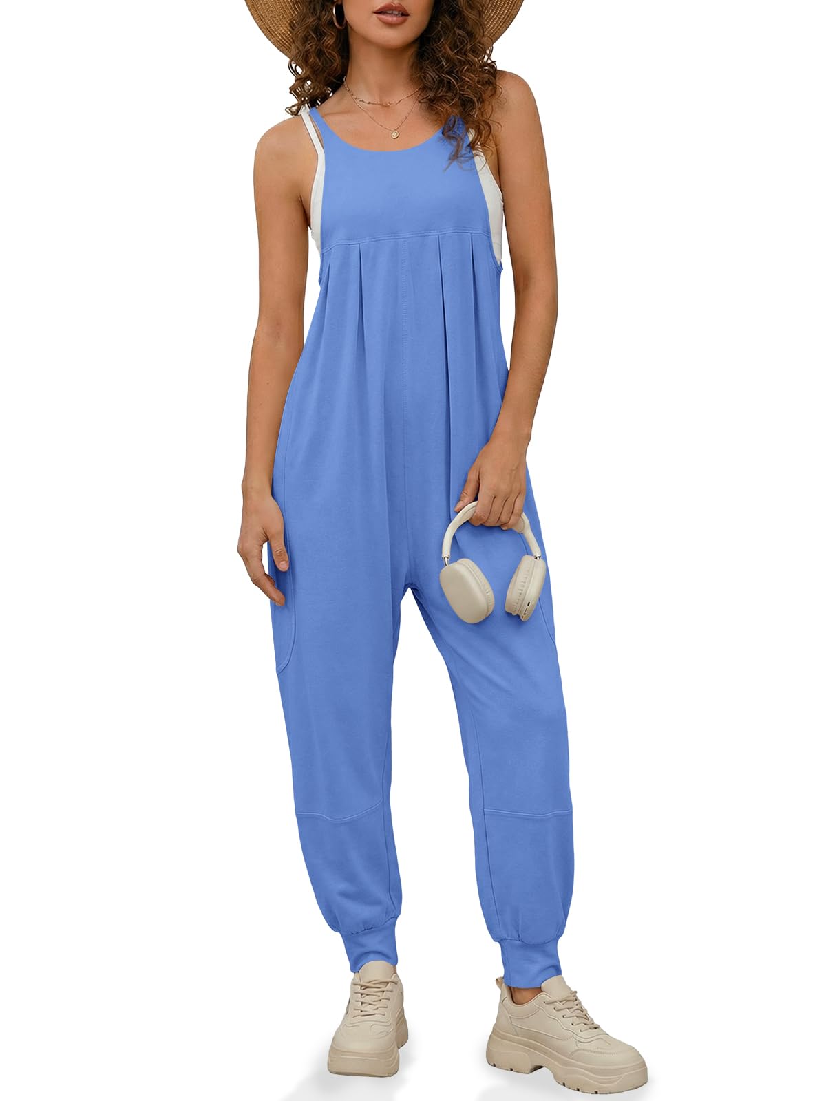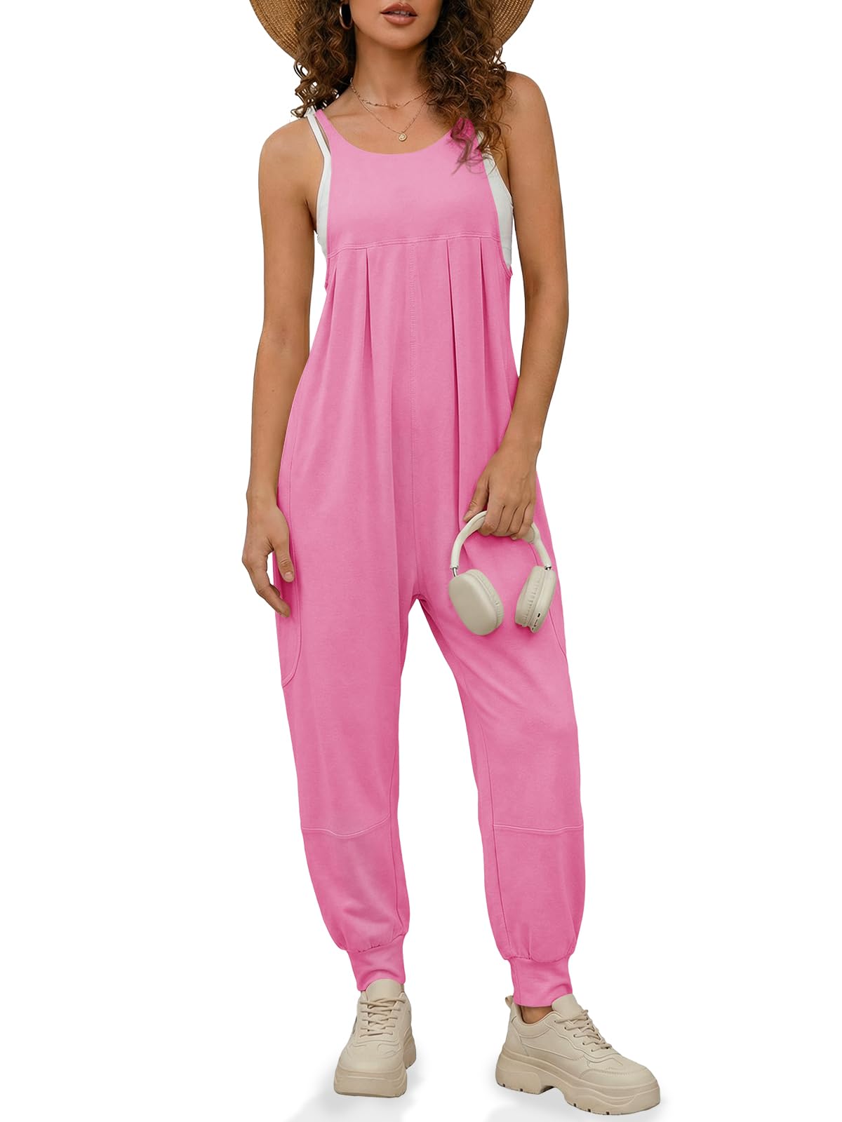 Fisoew Jumpsuits For Women Summer Casual Overalls Spaghetti Strap Sleeveless Pleated Rompers Jumpers With Pockets