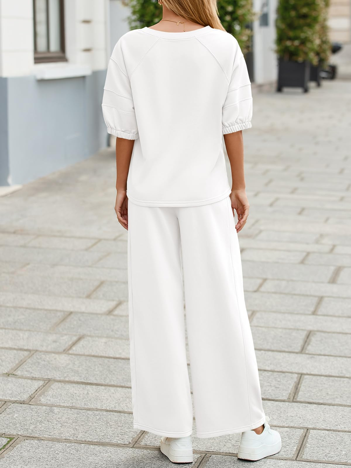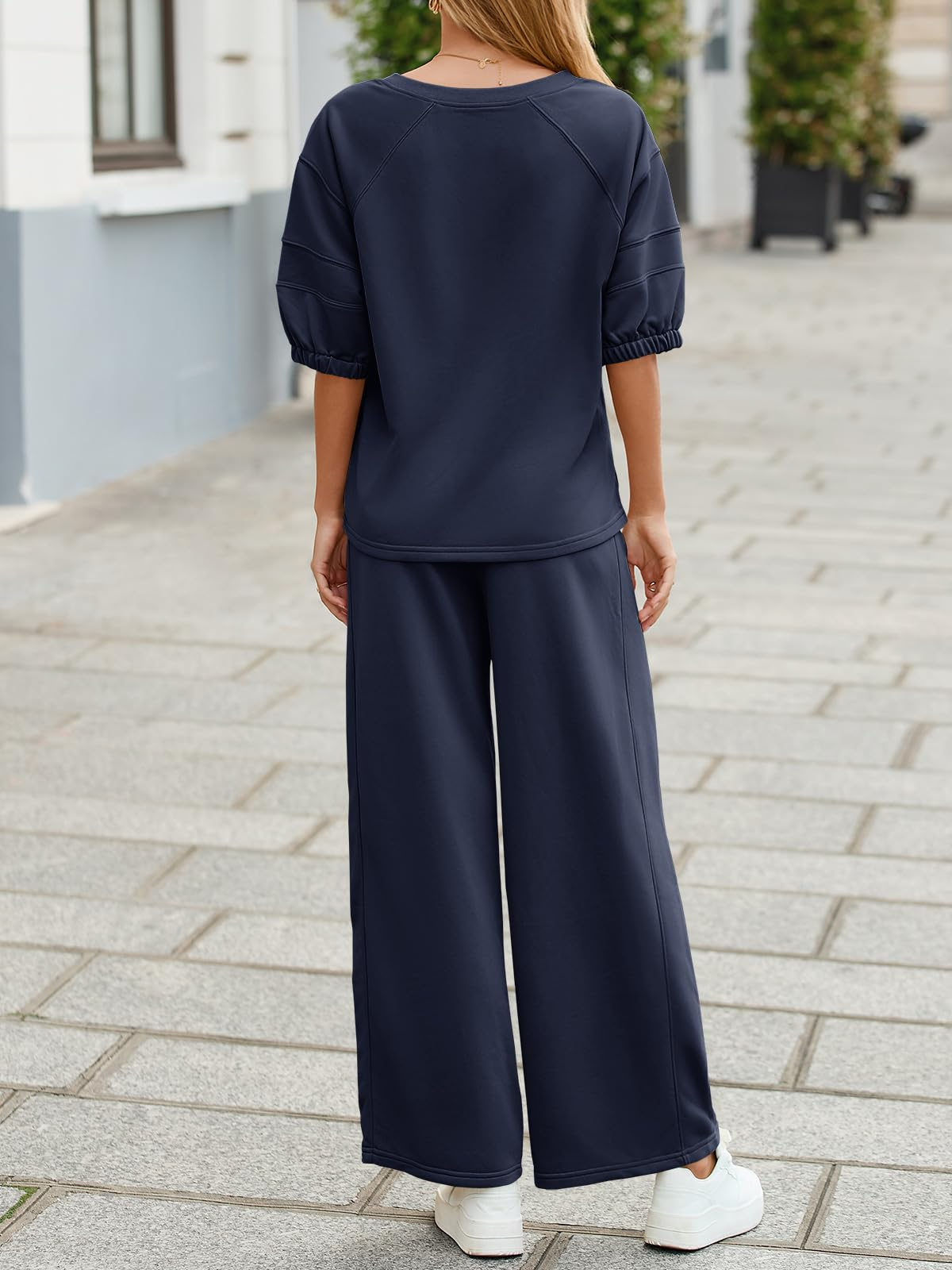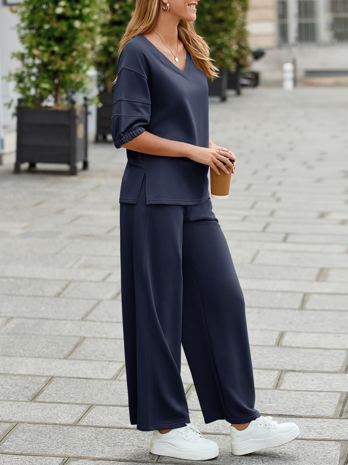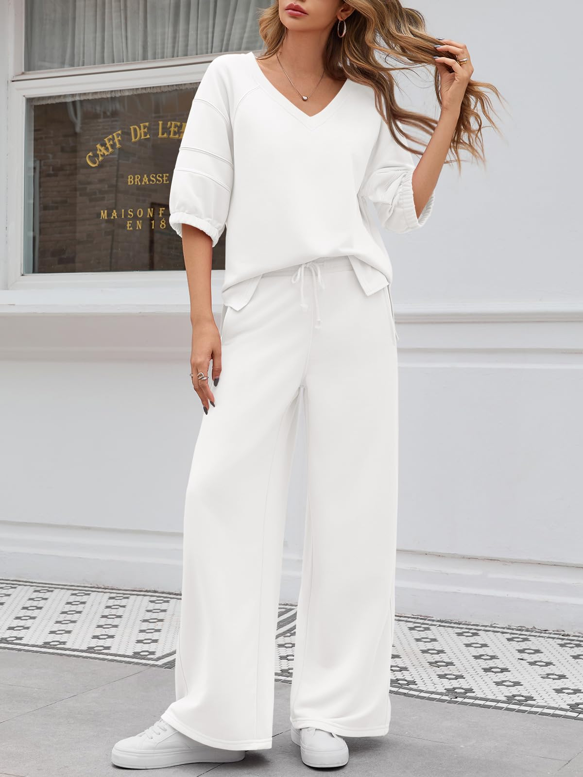 Fisoew Womens 2 Piece Outfits Casual V Neck Shirts Wide Leg Running Long Pants Loose Workout Tracksuit Sets