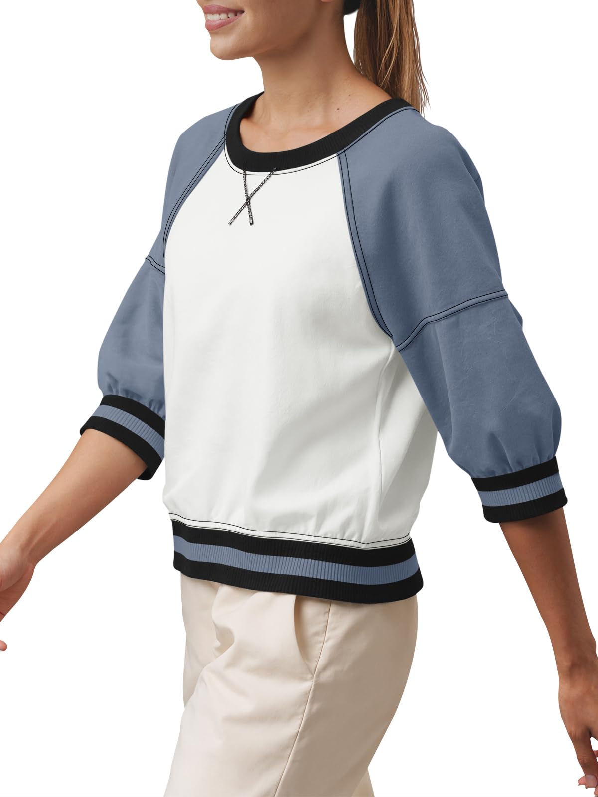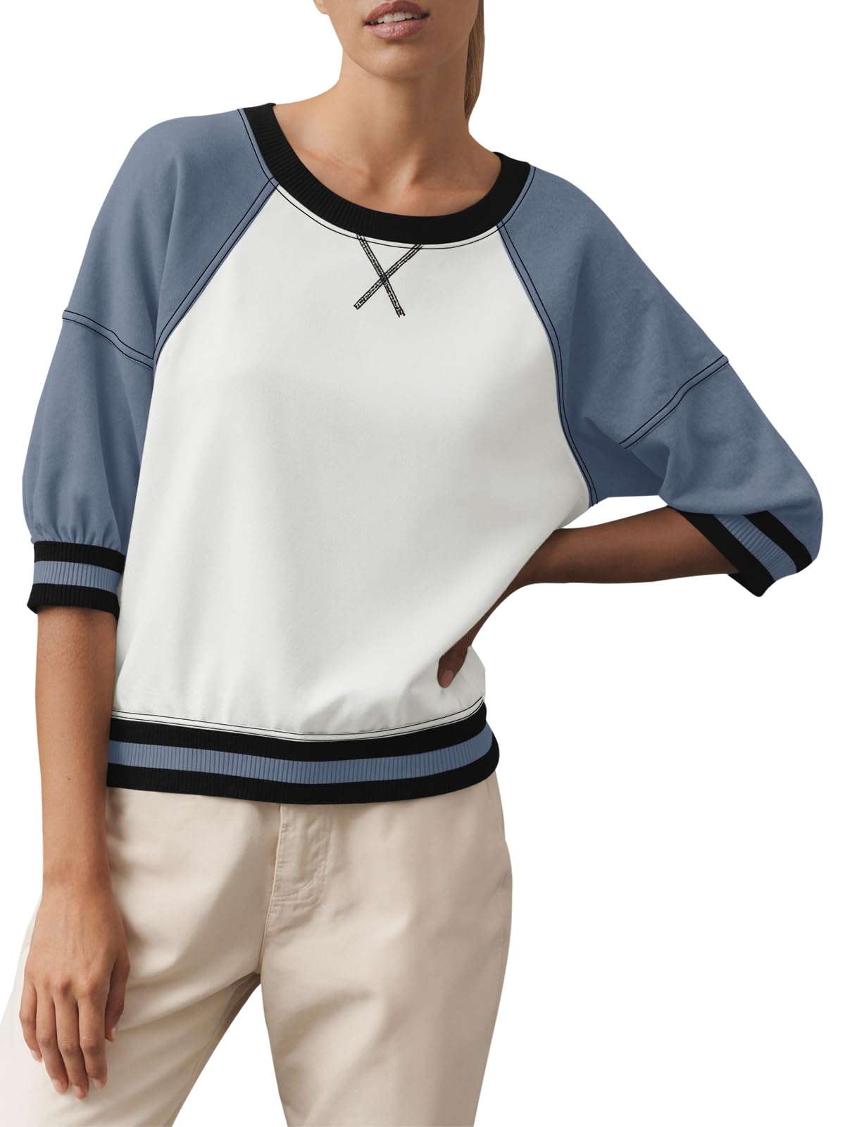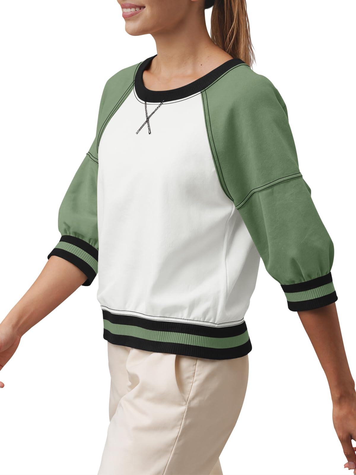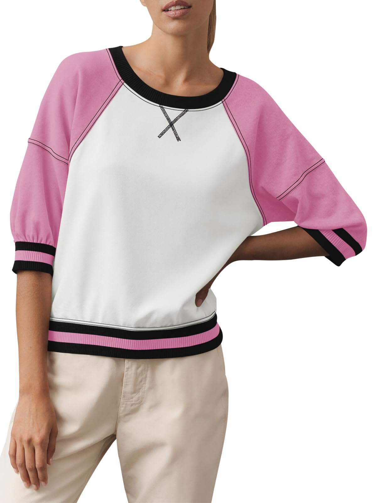 Fisoew Womens Crewneck Sweatshirt Ribbed Raglan Half Sleeve Pullover Tops Color Block Loose Fit Sweatshirts