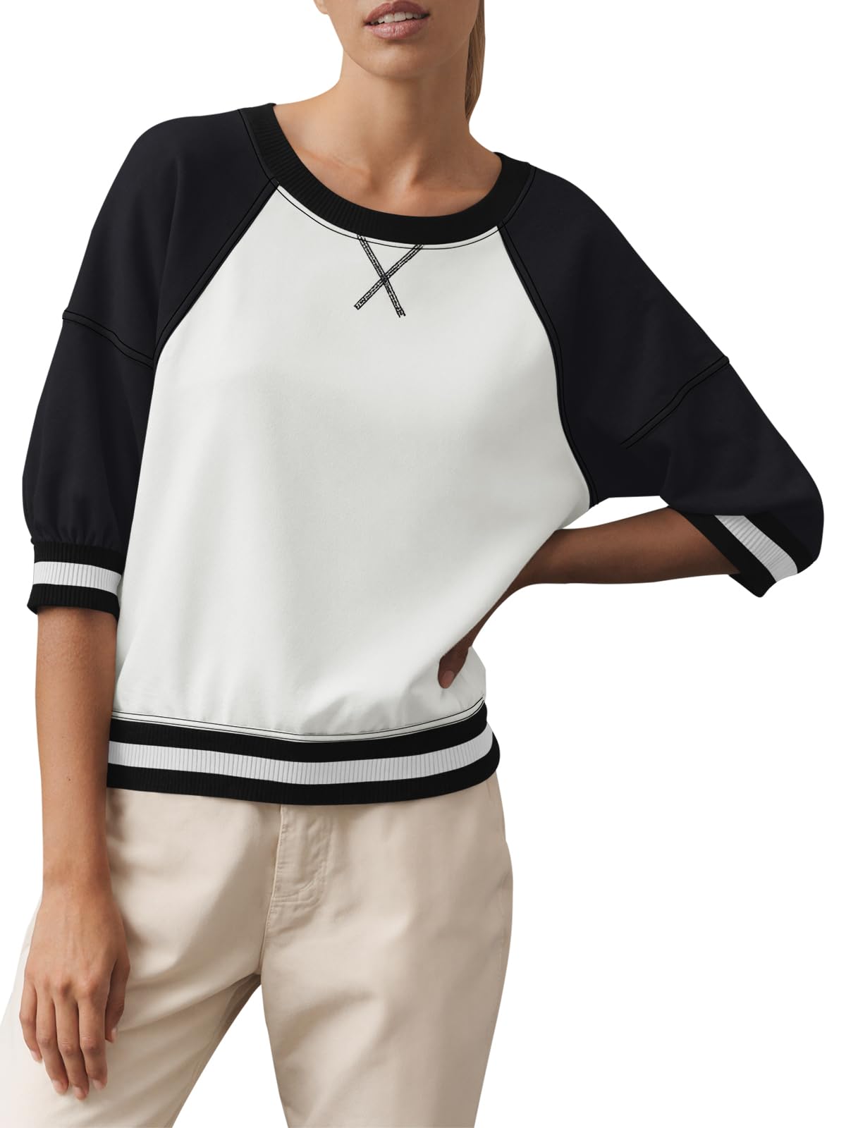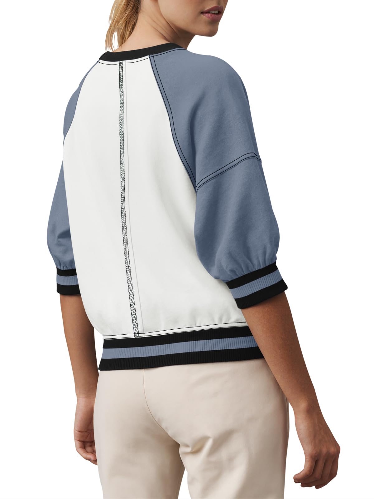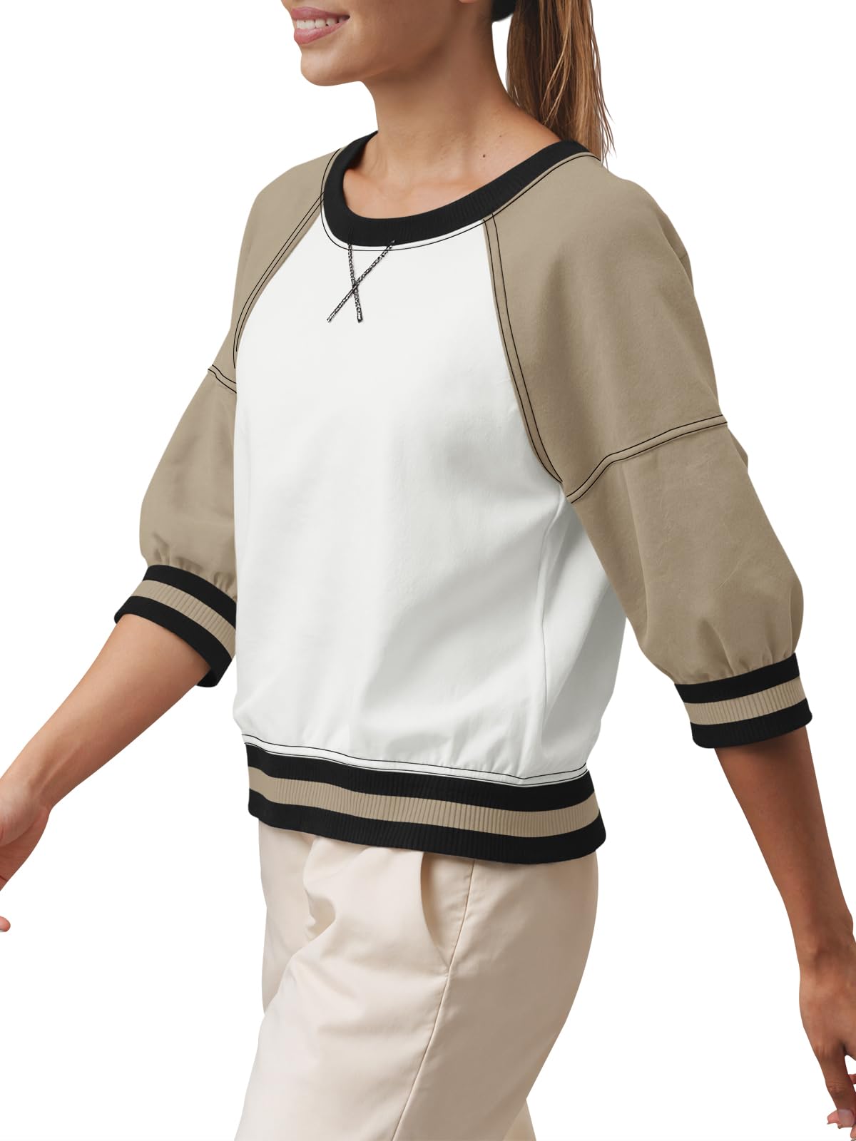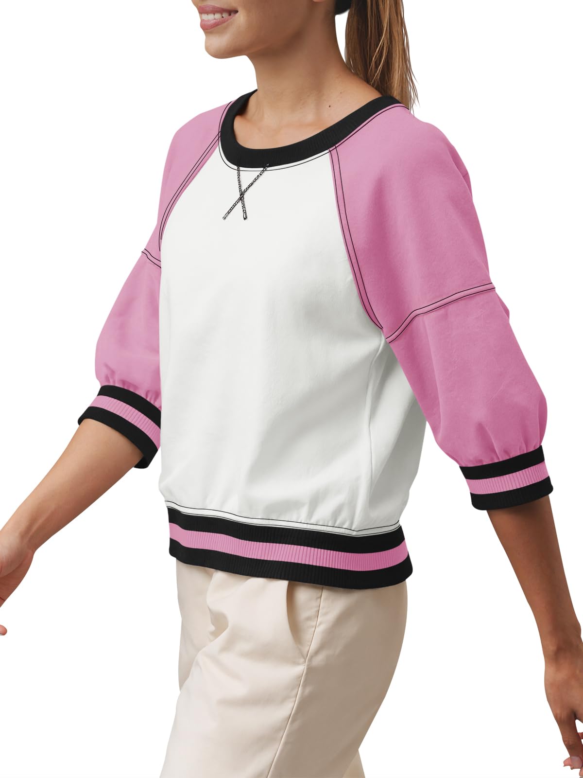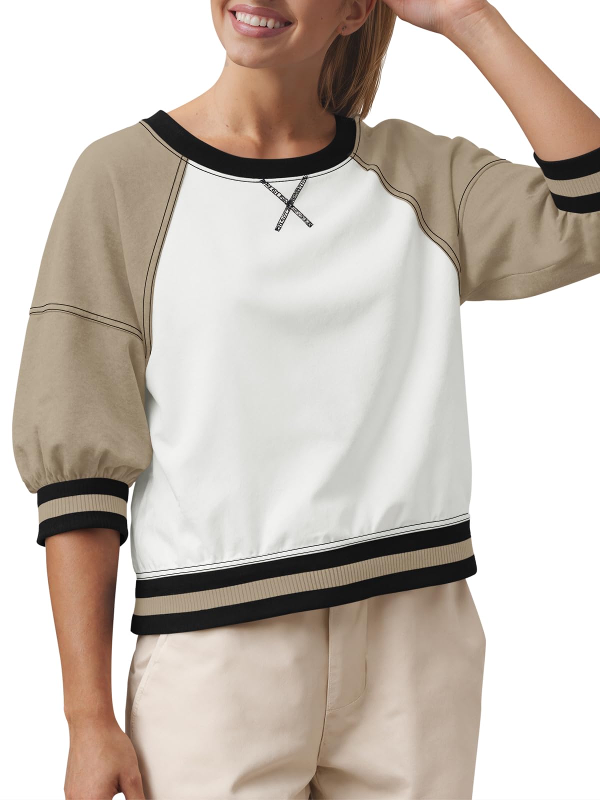 Fisoew Womens Crewneck Sweatshirt Ribbed Raglan Half Sleeve Pullover Tops Color Block Loose Fit Sweatshirts