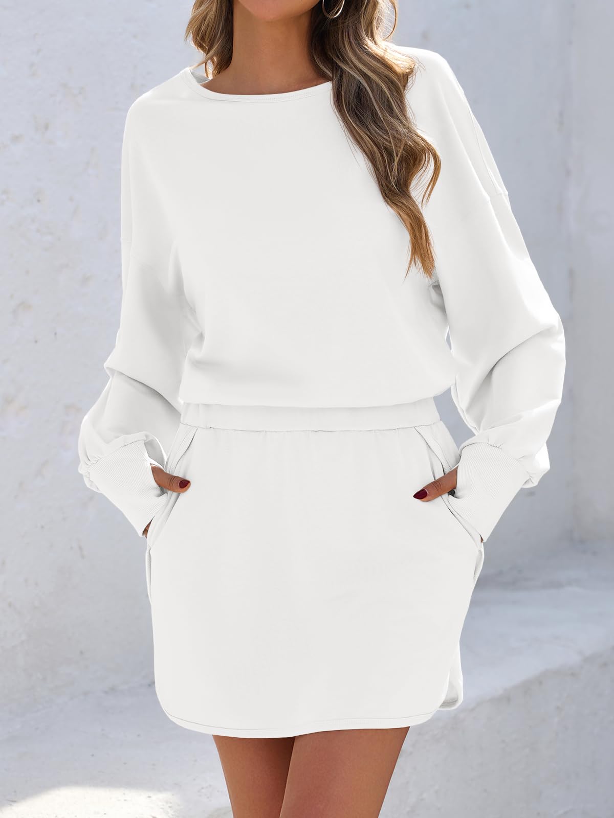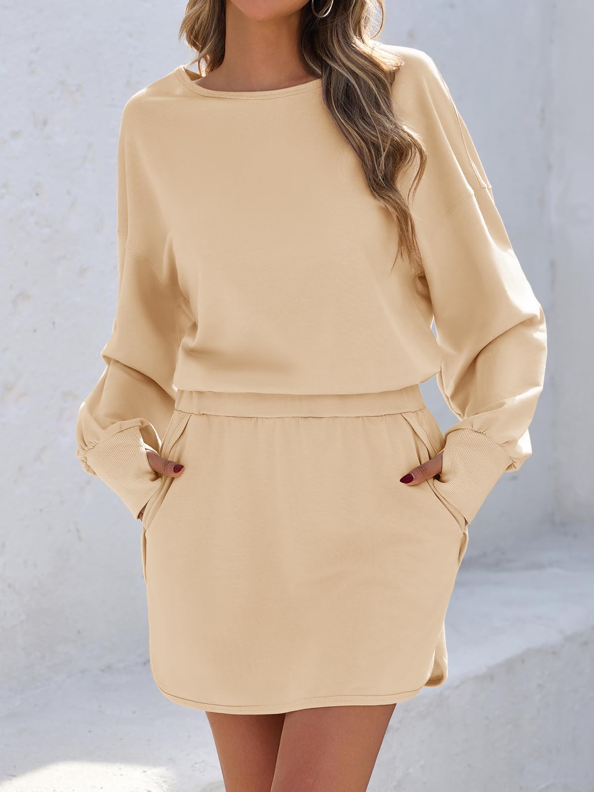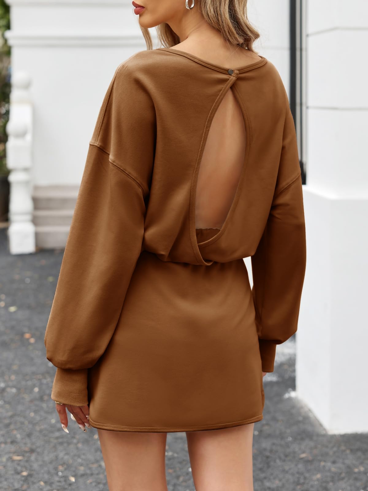 Dress Chic Design: Combining fashion with function, this long sleeve crewneck dress boasts a unique backless design accentuated by a keyhole detail, adding a touch of elegance to your activewear. It features built-in shorts for modesty and convenience. With thumbholes in the sleeves securing them in place and handy pockets for storing essentials