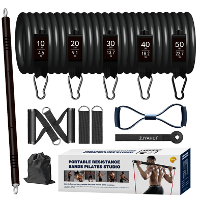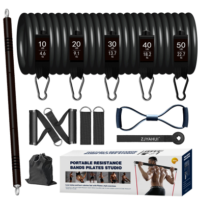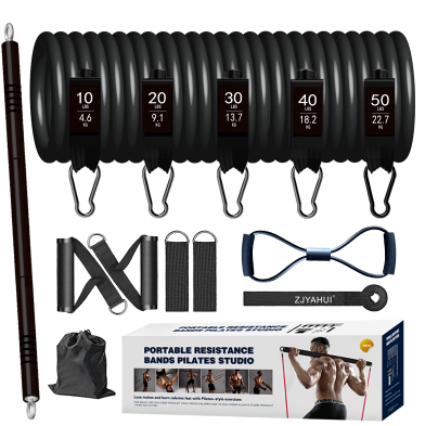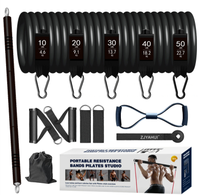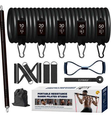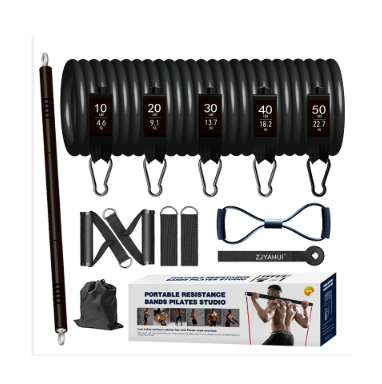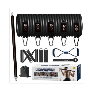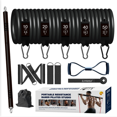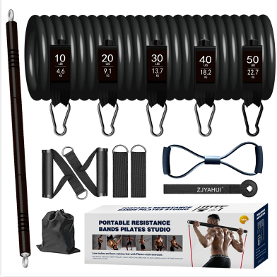 150pound TPE Bodhi stick set:2 foam handles, 2 foot rings, 1 door buckle, 1 storage bag, 5 tension ropes, 1 manual, 1 figure 8, 1 pole, 1 packaging bag, and 1 color box