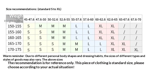 1. Asian sizes are 1 to 2 sizes smaller than European and American people. Choose the larger size if your size between two sizes. Please allow 2-3cm differences due to manual measurement. 2. Please check the size chart carefully before you buy the item, if you don't know how to choose size, please contact our customer service. 3.As you know, the different computers display colors differently, the color of the actual item may vary slightly from the following images.