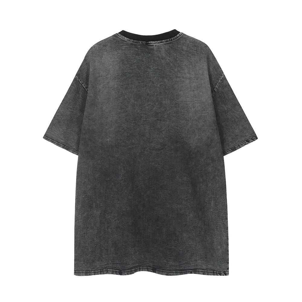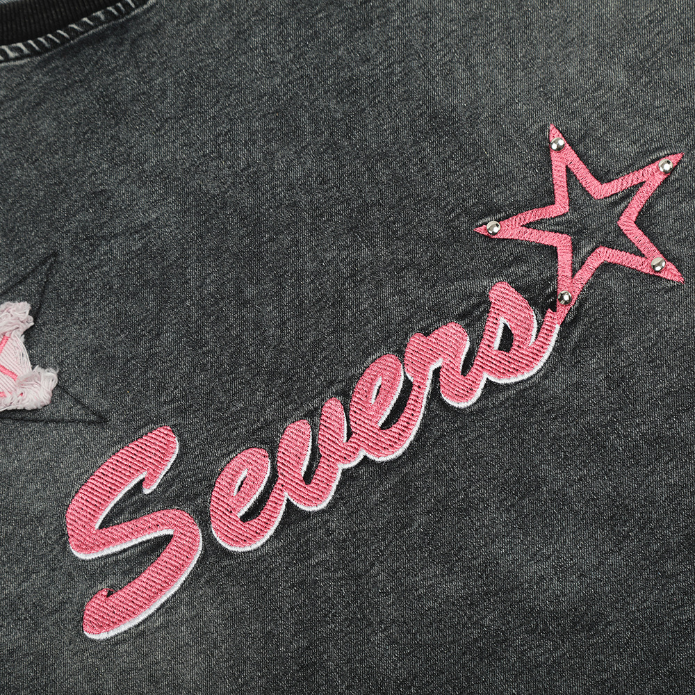 Five-pointed Star Patch Letter Distressed Wash Denim Short Sleeve