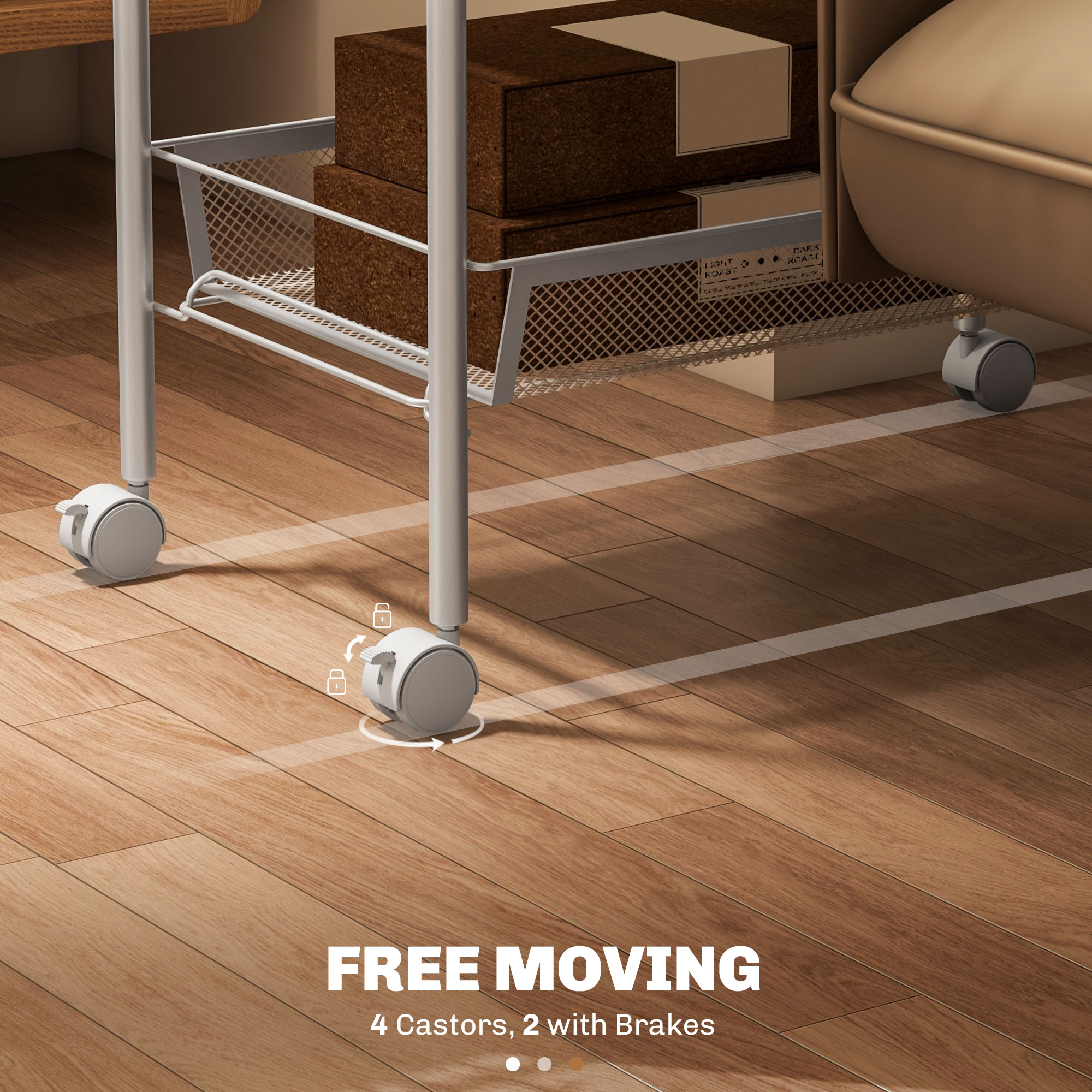 • Four wheels to move around easily, with two brakes to lock into place
