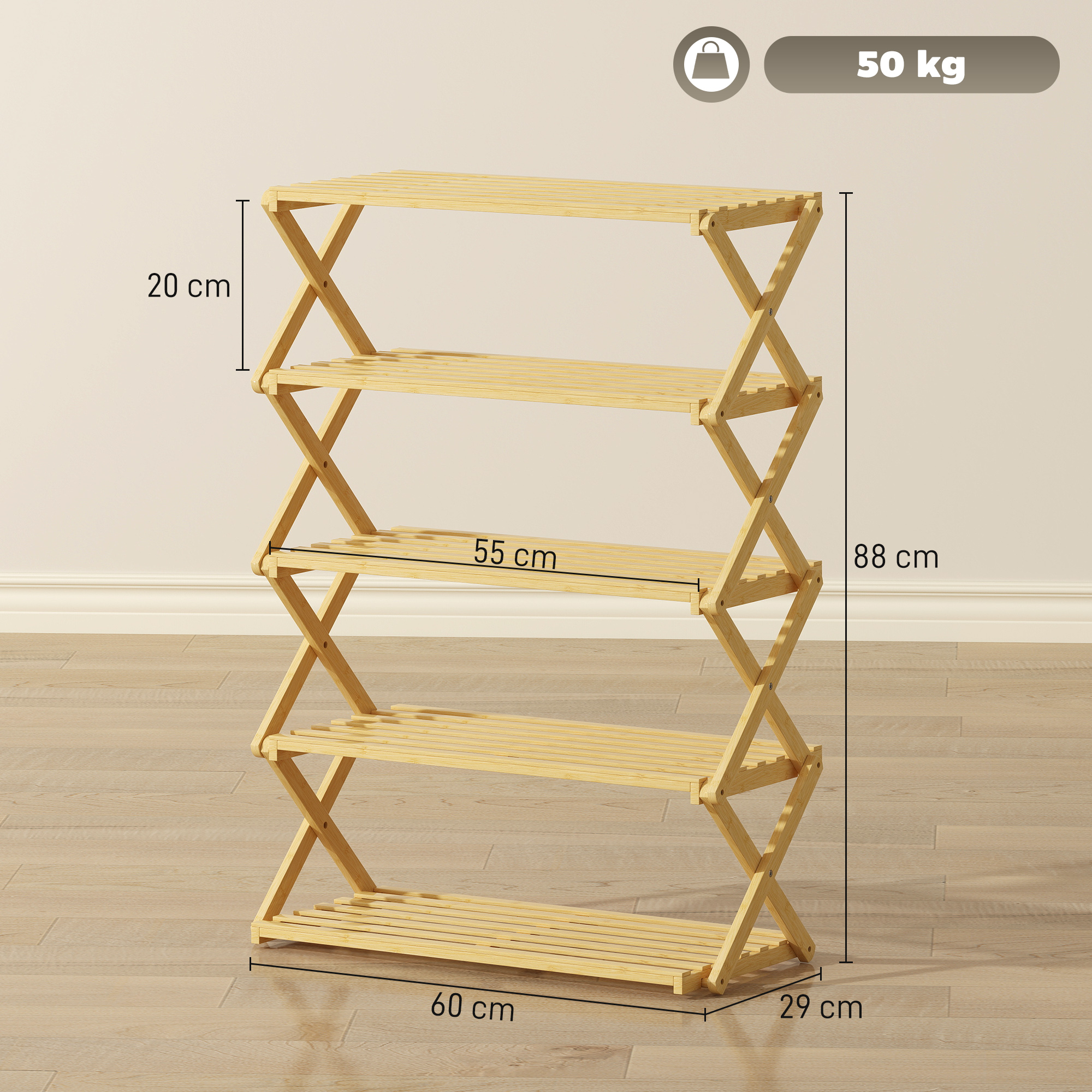 Unfold and organise footwear with our bamboo shoe rack. With five shelves, holding up to 15 shoe pairs, there is plenty of room for boots, trainers, heels and more. Made from bamboo, this is a strong and beautiful piece, finished with a clear varnish coat for gentle protection.