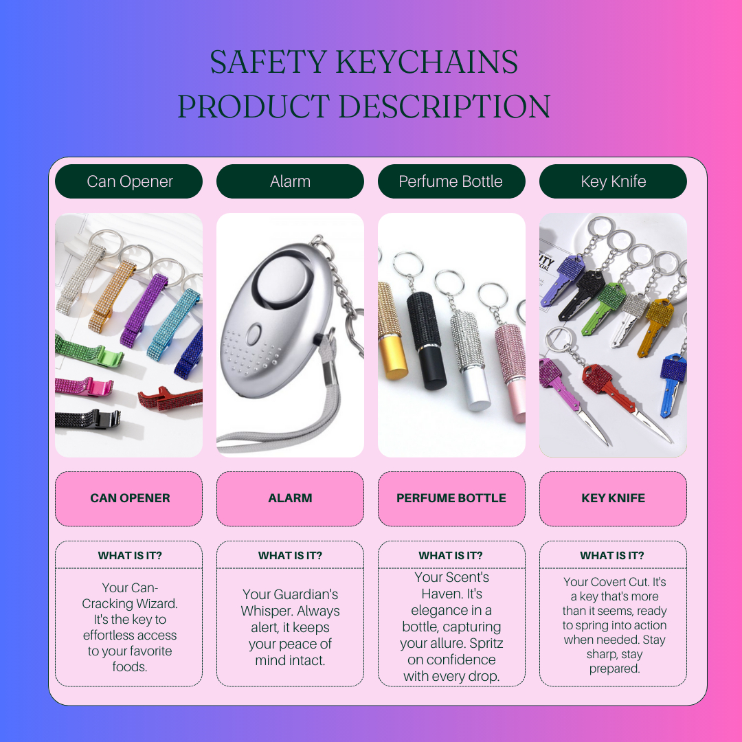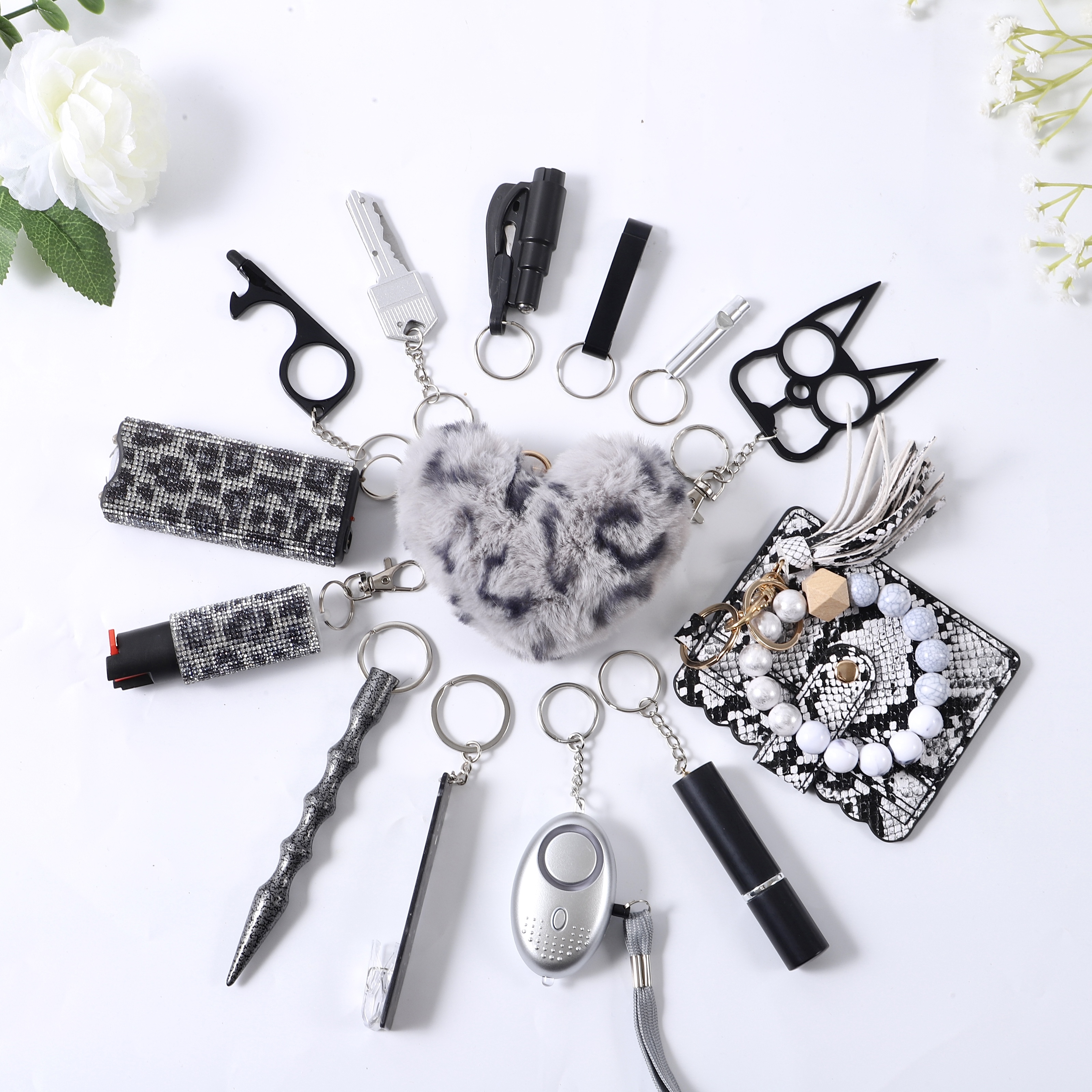 This set offers a versatile and stylish collection of items, including a card holder and bracelet combo, a pom-pom, kitty knuckle, whistle, can opener, window breaker, key knife, door pull, taser, pepper spray, kubaton, alarm, card grabber, and a perfume bottle. Each item serves a distinct purpose, combining practicality with a touch of fashion to meet various needs in daily life.