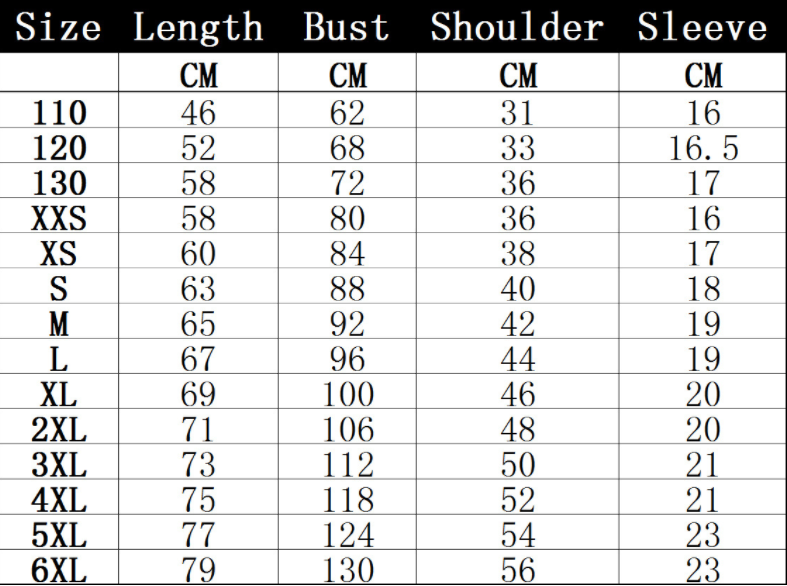 Size: XXS, XS, S, M, L, XL, XXL, 3XL, 4XL, 5XL, 6XL