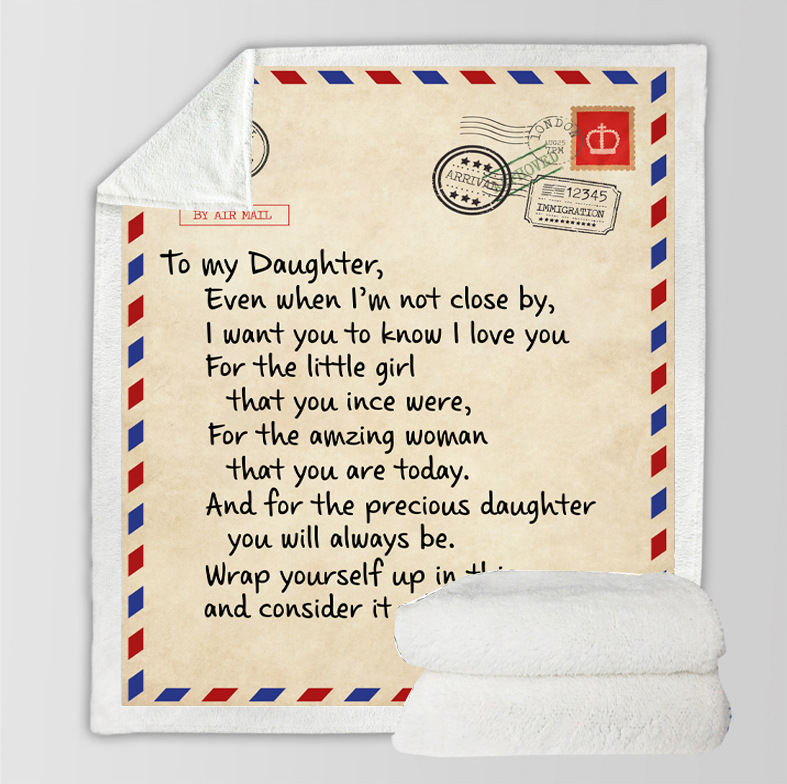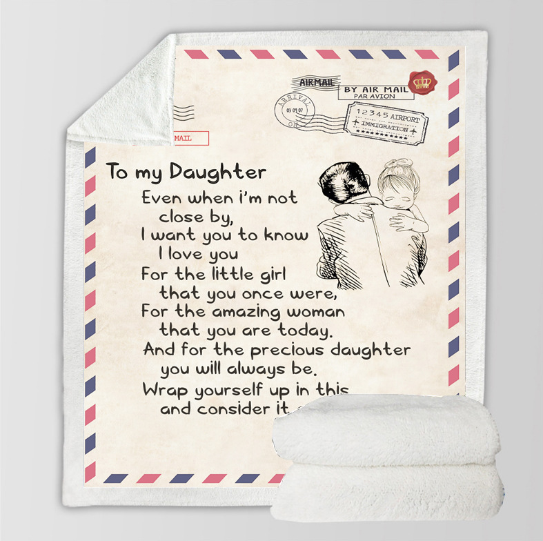 This super-soft flannel blanket is designed for a thoughtful caring personal gift for a daughter from dad and mom. The intent of this blanket is not only to bring warmth but also bring a smile, courage, and a feeling of love.