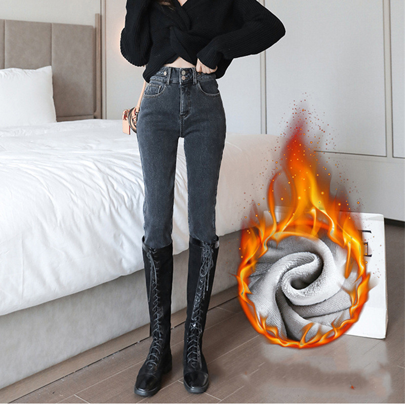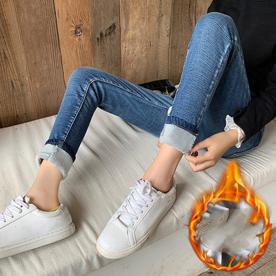 Fleece Pants Women'S Autumn And Winter New High Waist Slim Nine Points Plus Cotton Jeans Warm Leggings Outer Wear Trousers