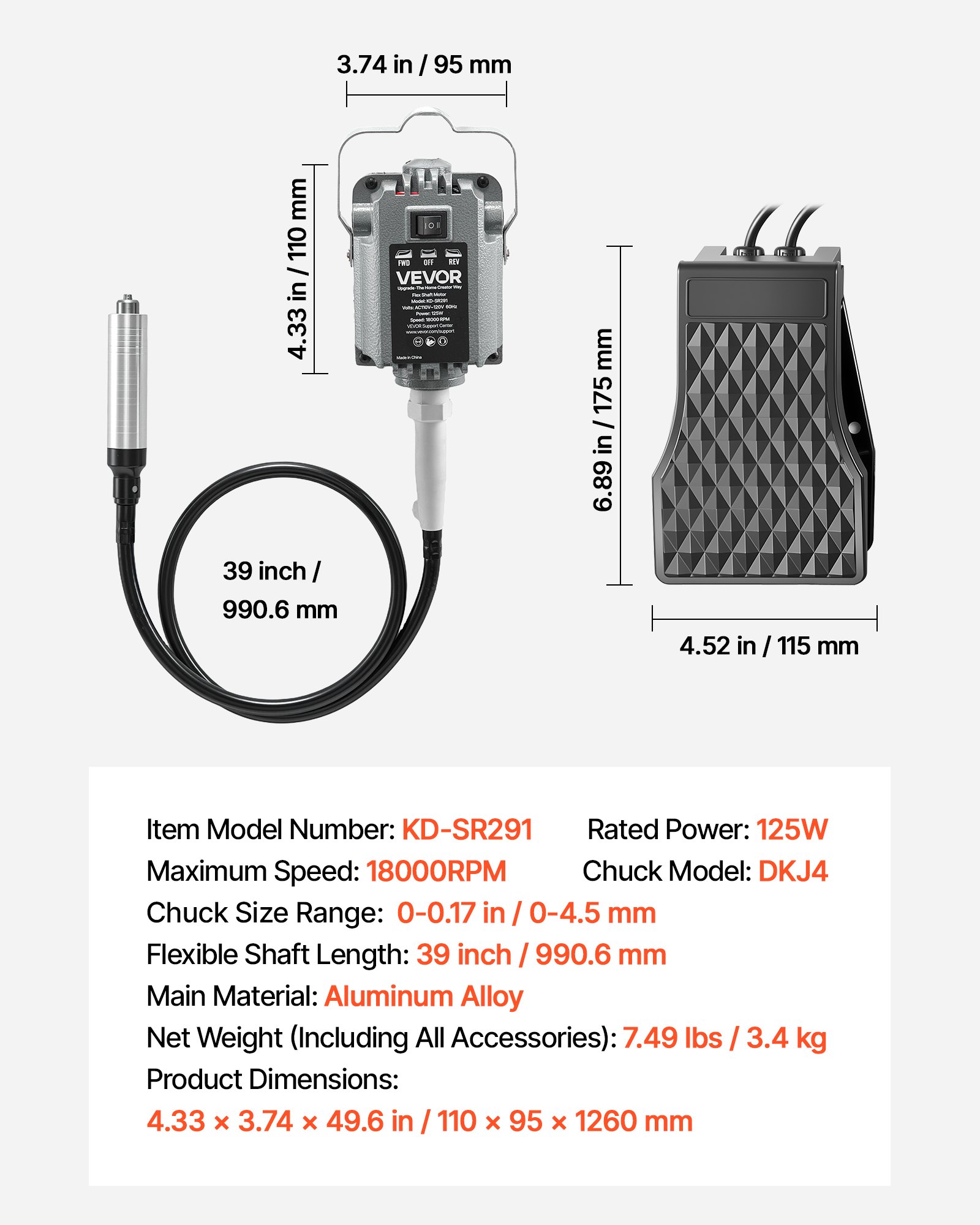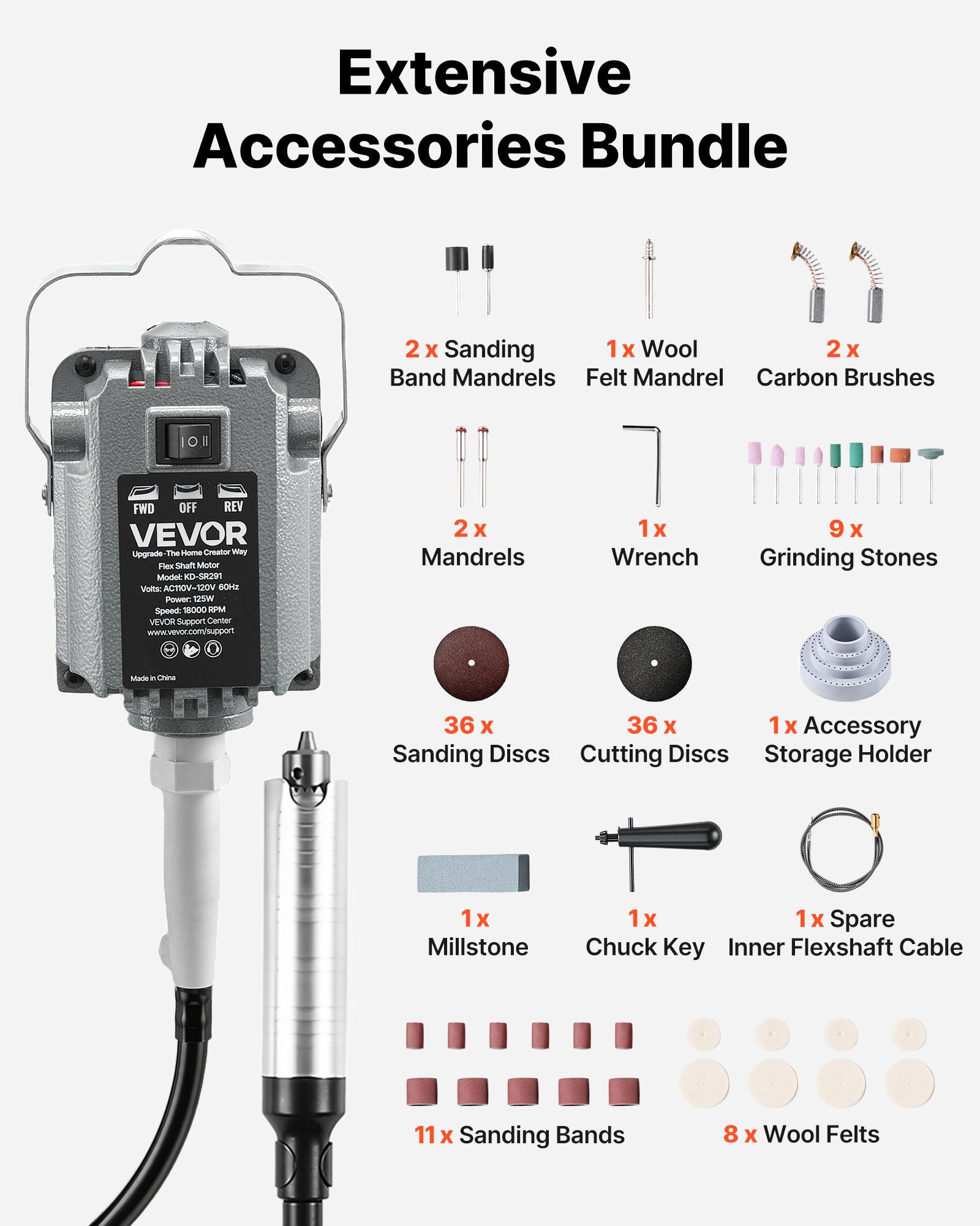 Strong Motor Output: Powered by a 125W copper motor with speeds up to 18000 RPM, VEVOR flex shaft grinder delivers smooth, efficient performance for sanding, grinding, cutting, and polishing tasks. Supports forward-reverse rotation for added flexibility