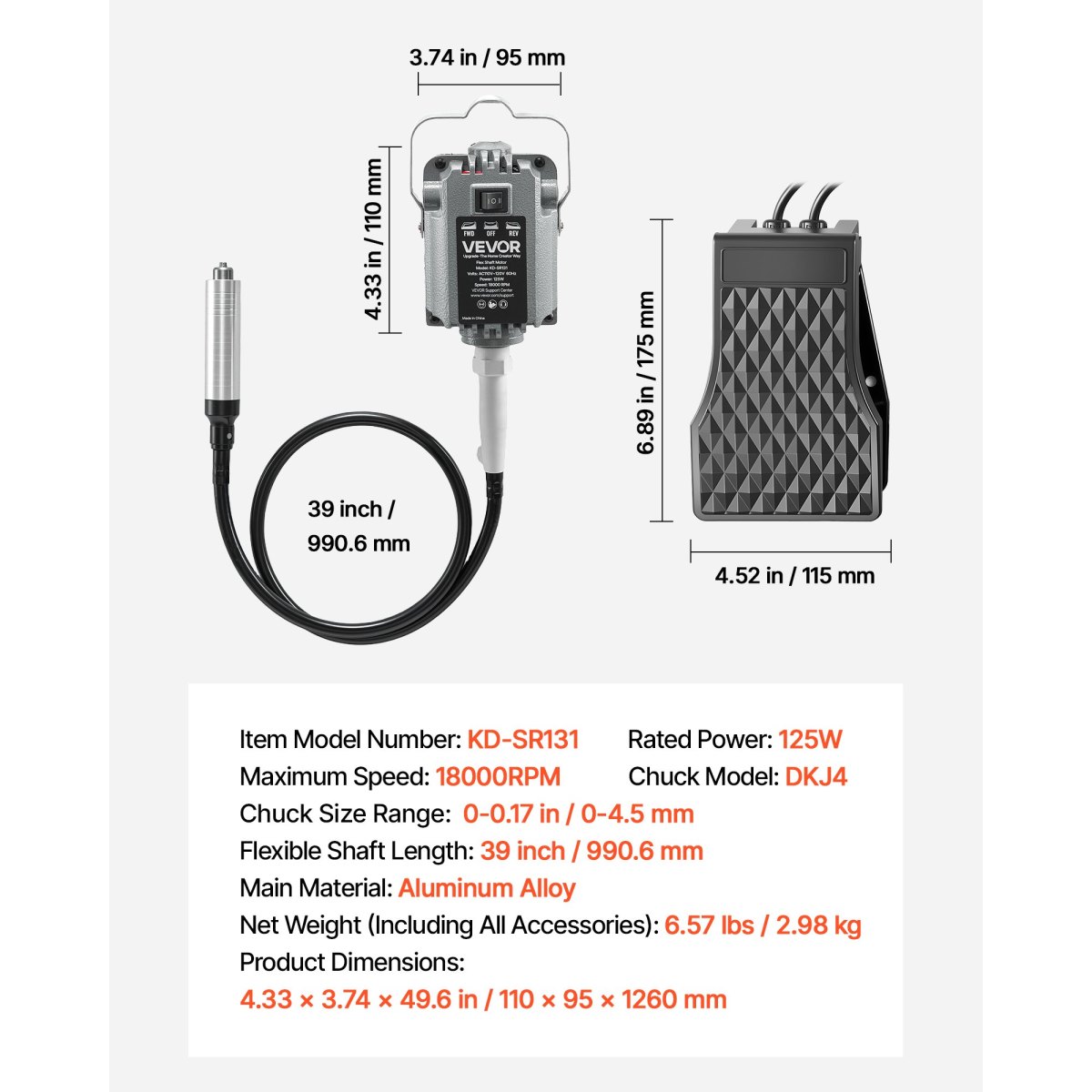 Strong Motor Output: Powered by a 125W copper motor with speeds up to 18,000 RPM, VEVOR flex shaft grinder delivers smooth, efficient performance for carving, grinding, drilling, and polishing tasks. Supports forward-reverse rotation for added flexibility