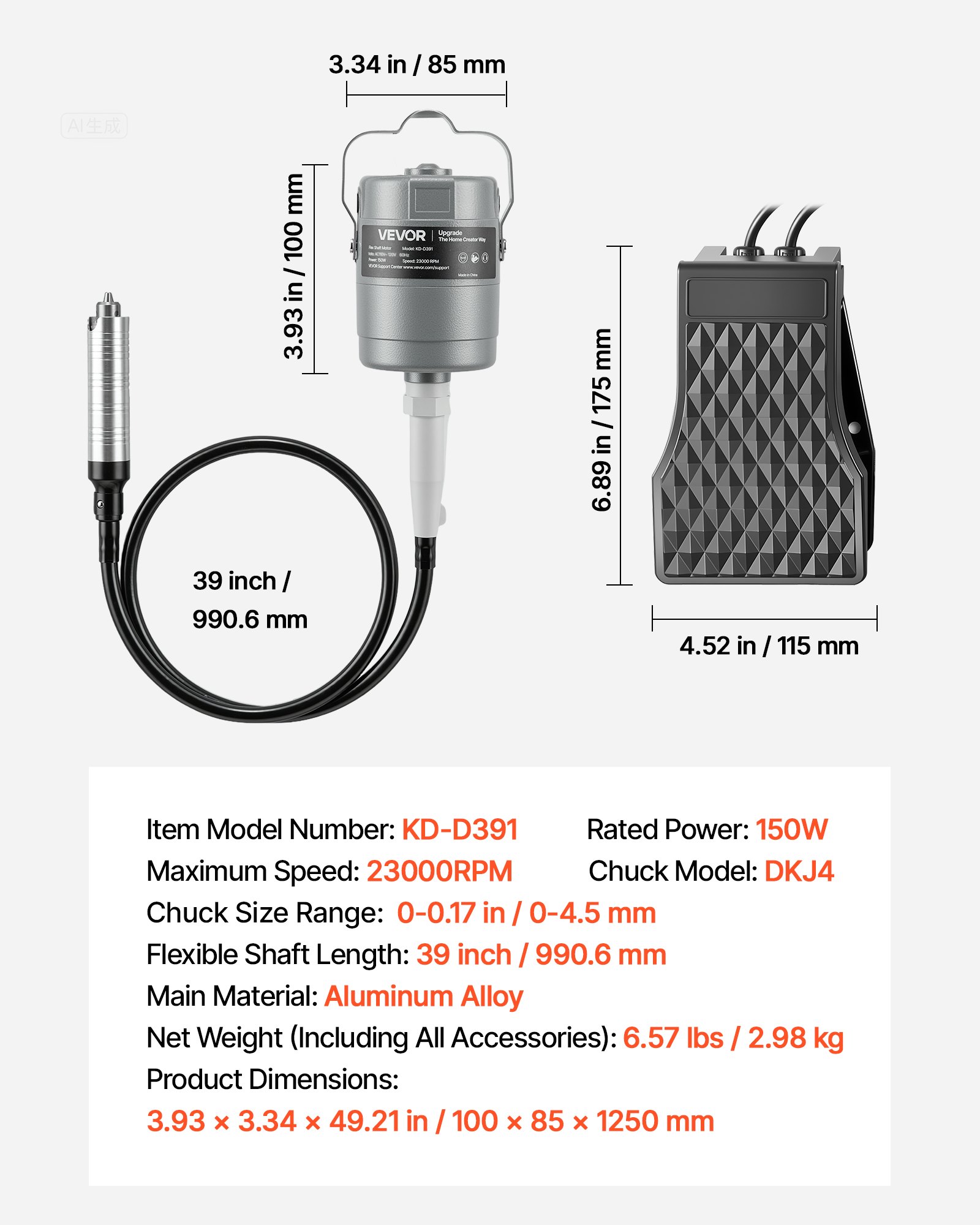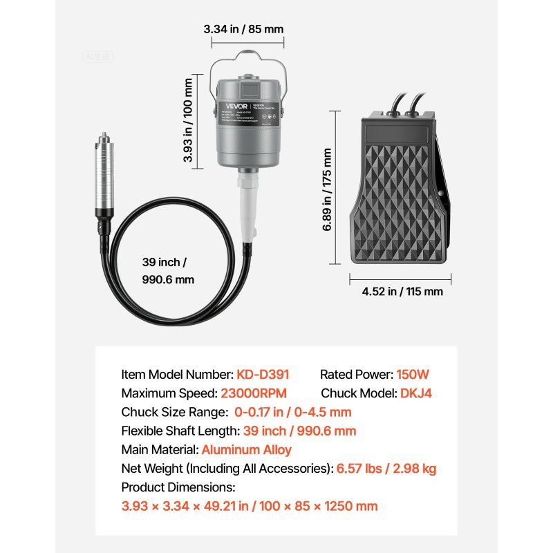 Strong Motor Output: Powered by a 150W copper motor with speeds up to 23000 RPM, VEVOR flex shaft grinder delivers smooth, efficient performance, handling sanding, grinding, cutting, and polishing tasks with precision and speed