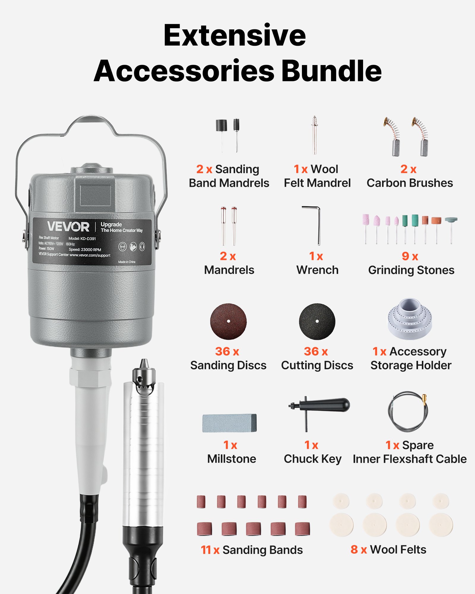Complete Accessories: Comes with 9 grinding stones, 11 sanding bands, 36 sanding discs, 8 wool felts, 1 millstone, 36 cutting discs, 5 mandrels, 1 wrench, 1 accessory storage holder, along with 1 chuck key, 2 carbon brushes and 1 spare inner flex shaft cable