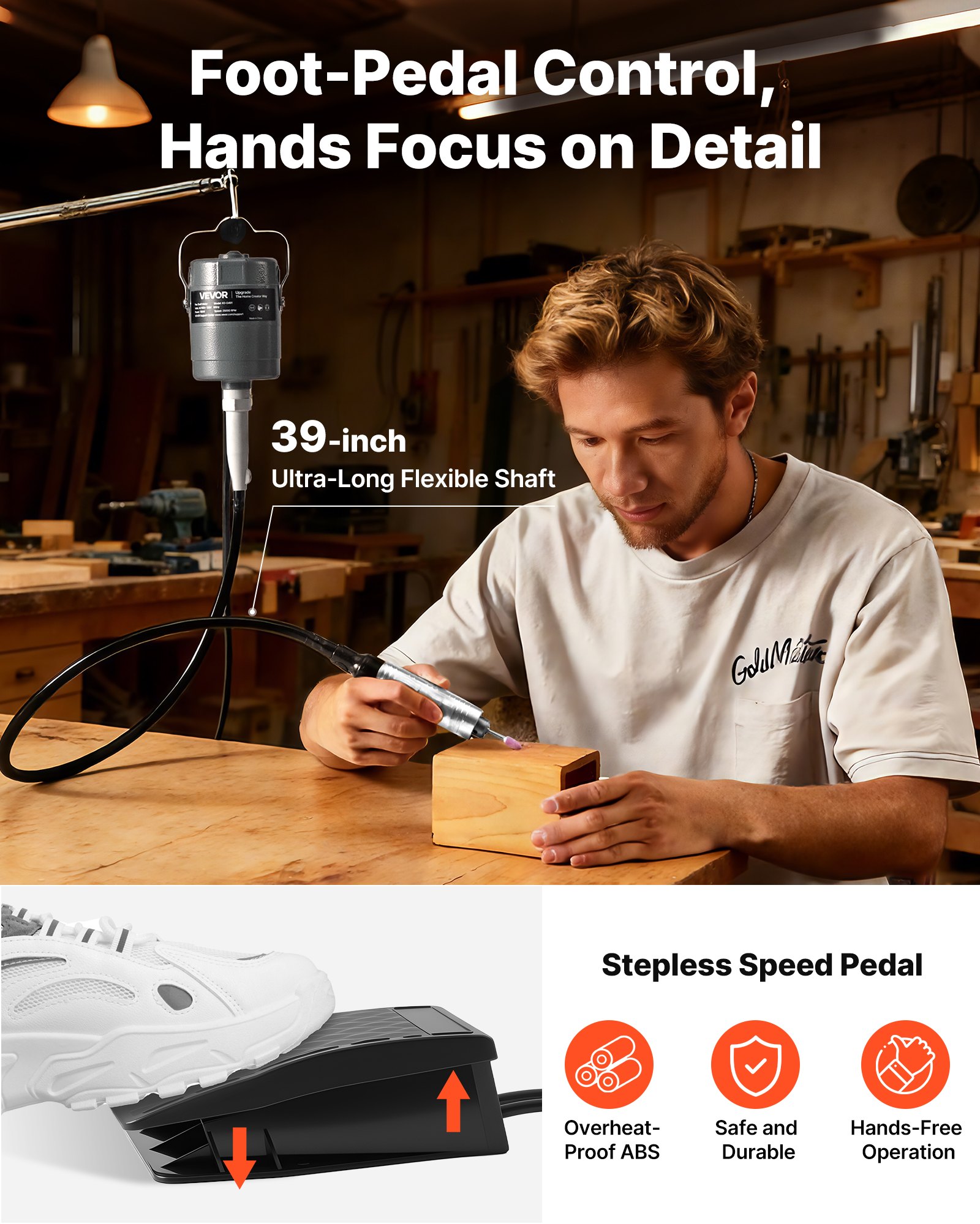 Hands-Free Foot Pedal: Control stepless speed adjustment using the foot pedal for a smoother workflow, keeping both hands focused on detailed tool handling. Built with overheat-resistant ABS for secure, reliable operation