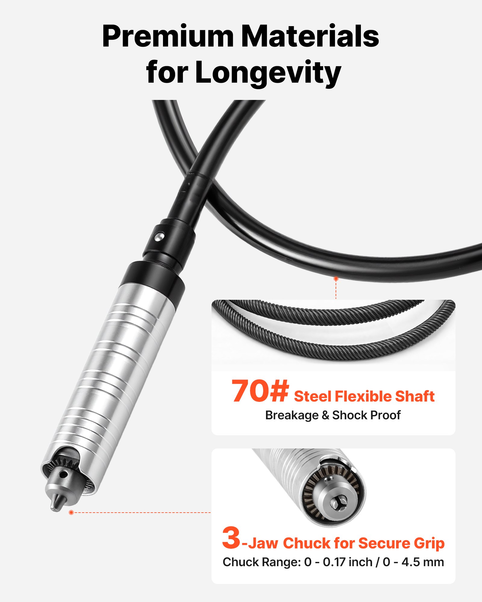 High-Precision Chuck: Featuring a 3-jaw chuck with a 0–4.5 mm (0–0.17 in) clamping range, this flex shaft rotary tool securely holds accessories without slipping. Paired with a 39-inch extended flexible shaft for improved reach and control