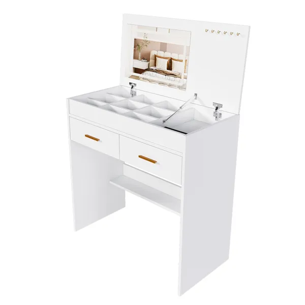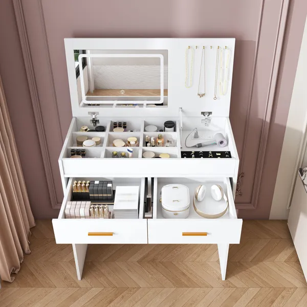 Space-Saving Flip-Top Design: This vanity features a flip-down mirror that opens effortlessly for makeup application and closes neatly to transform into a sleek desk or cabinet. Perfect for small spaces, it maximizes functionality while maintaining a minimalist aesthetic. Adjustable LED Illuminated Mirror: Equipped with a built-in LED mirror offering 3 customizable color temperatures (warm, cool, natural) and adjustable brightness levels. Enjoy optimal lighting for precision makeup, skincare, or grooming at any time of day. Built-in Power Outlet for Convenience: Integrated electrical outlet with USB port allows you to plug in hair dryers, curling irons, or charge devices like phones and tablets directly at the vanity. Streamline your beauty routine without searching for wall sockets. Smart Storage Design: Features 2 spacious drawers for cosmetics and daily essentials; open divided jewelry organizer for accessories or small items; plus dedicated hooks to neatly arrange necklaces, bracelets, and other pieces. Everything stays tidy and within easy reach. Versatile & Stool-Free Design: Designed without a stool to save space and offer flexibility—use your own seating or pair with any chair. Ideal for bedrooms, apartments, or dressing rooms, combining makeup vanity, desk, and storage cabinet in one modern piece.