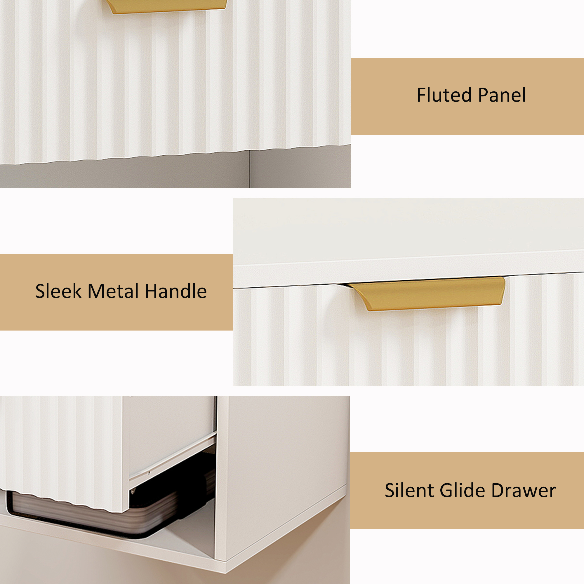 Struggling with a cluttered, cramped bedroom that disrupts your peace? The constant battle with dust under bulky furniture and the jarring sound of a closing drawer can spoil the serenity of your personal sanctuary. Elevate your space with the wall-mounted nightstands. Their floating design creates an airy, easy-to-clean oasis, while the silent-glide drawer on this side table ensures tranquility. The fluted panels and gold tone handle add a touch of modern elegance.